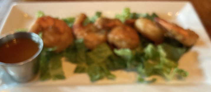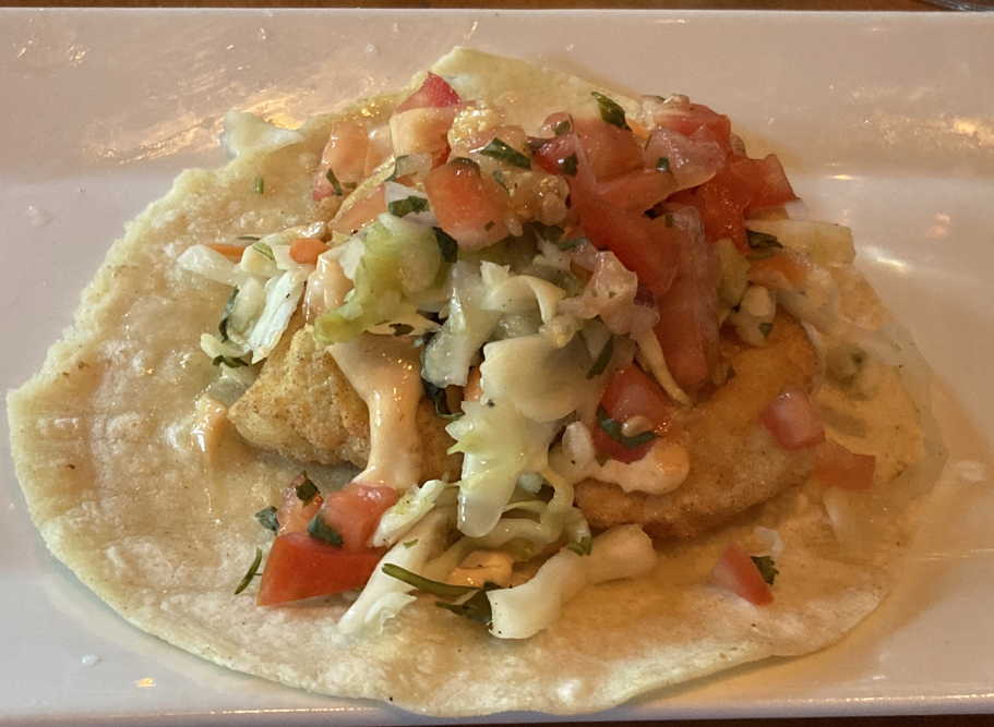 Just kidding. It still has the original name. And we got five oysters—count them, five. I say “we,” but Barbara grabbed all five for herself and says they were delicious. (Actually, I don’t like oysters. Mussels yes, but not oysters.) I started with the fried cod taco, which came with cilantro-honey slaw, chipotle aioli, and pico de gallo. Yum!