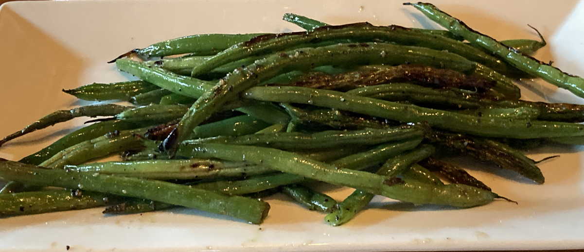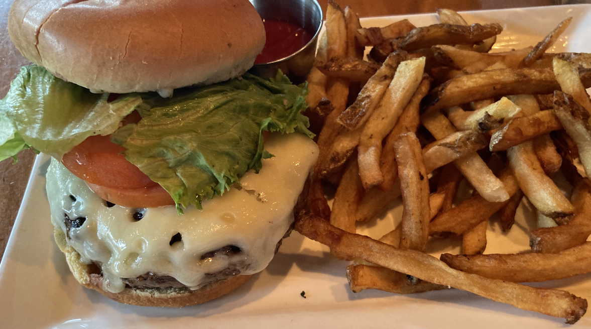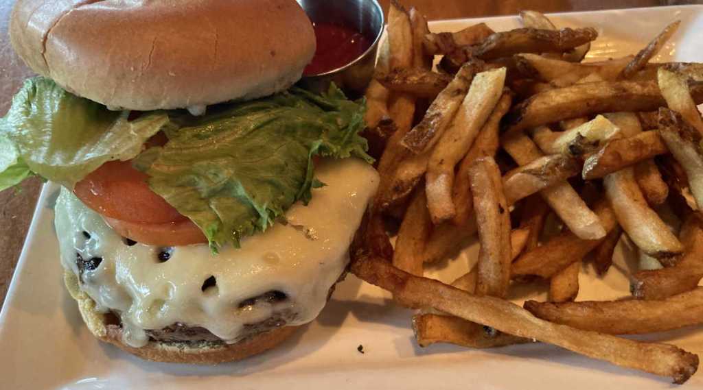 I had a standard entrée—a burger with Swiss cheese, cooked rare as ordered, with fries—but Barbara had an app and a side instead of an entrée: the always-excellent fried jumbo shrimp with spicy mango dip (she gave one to me) plus French green beans.