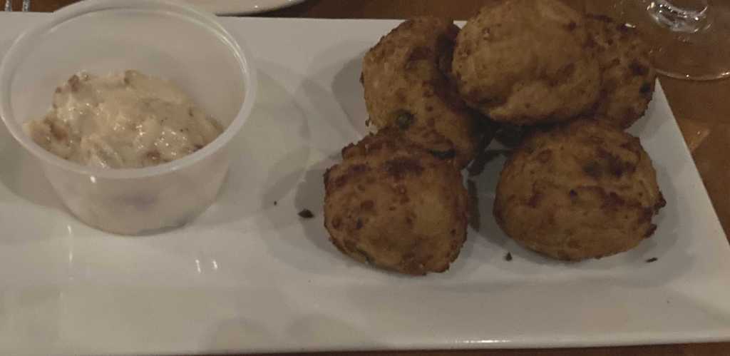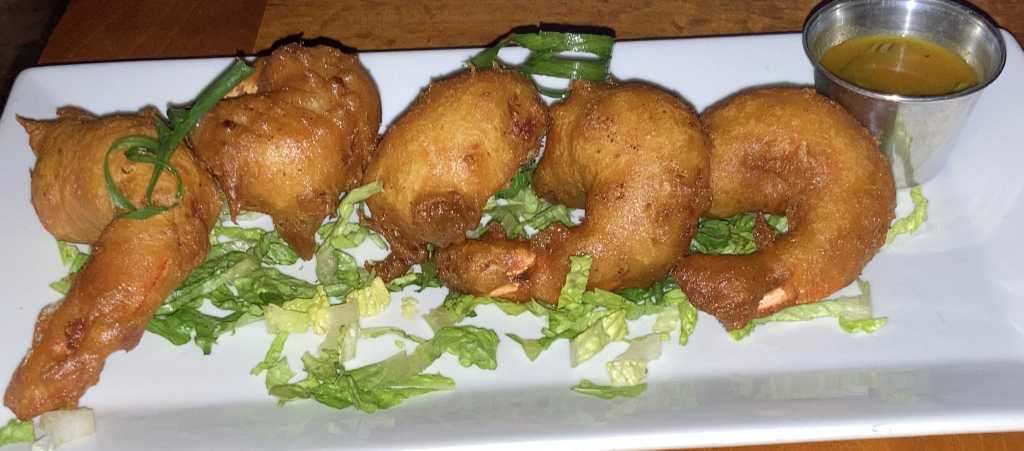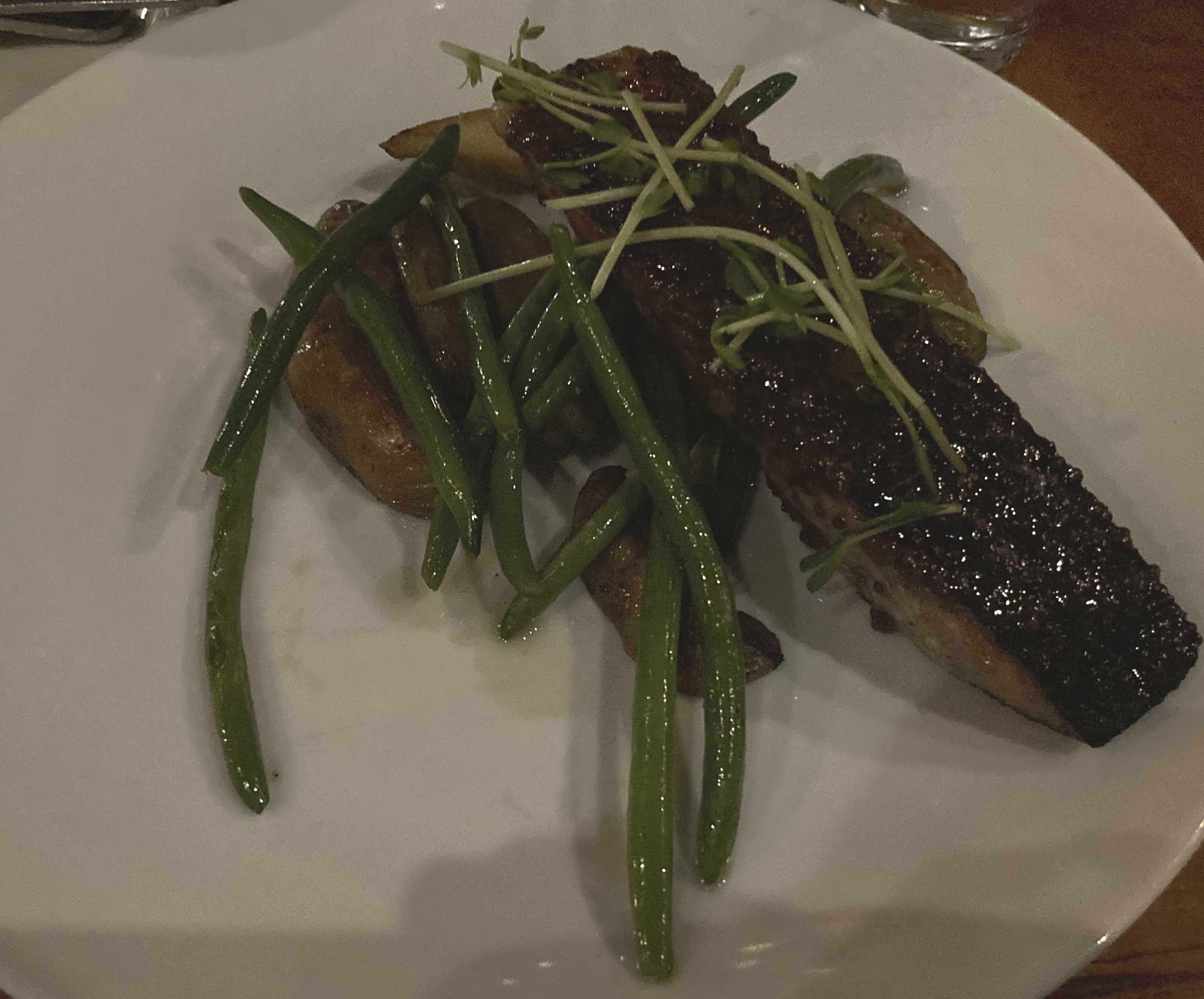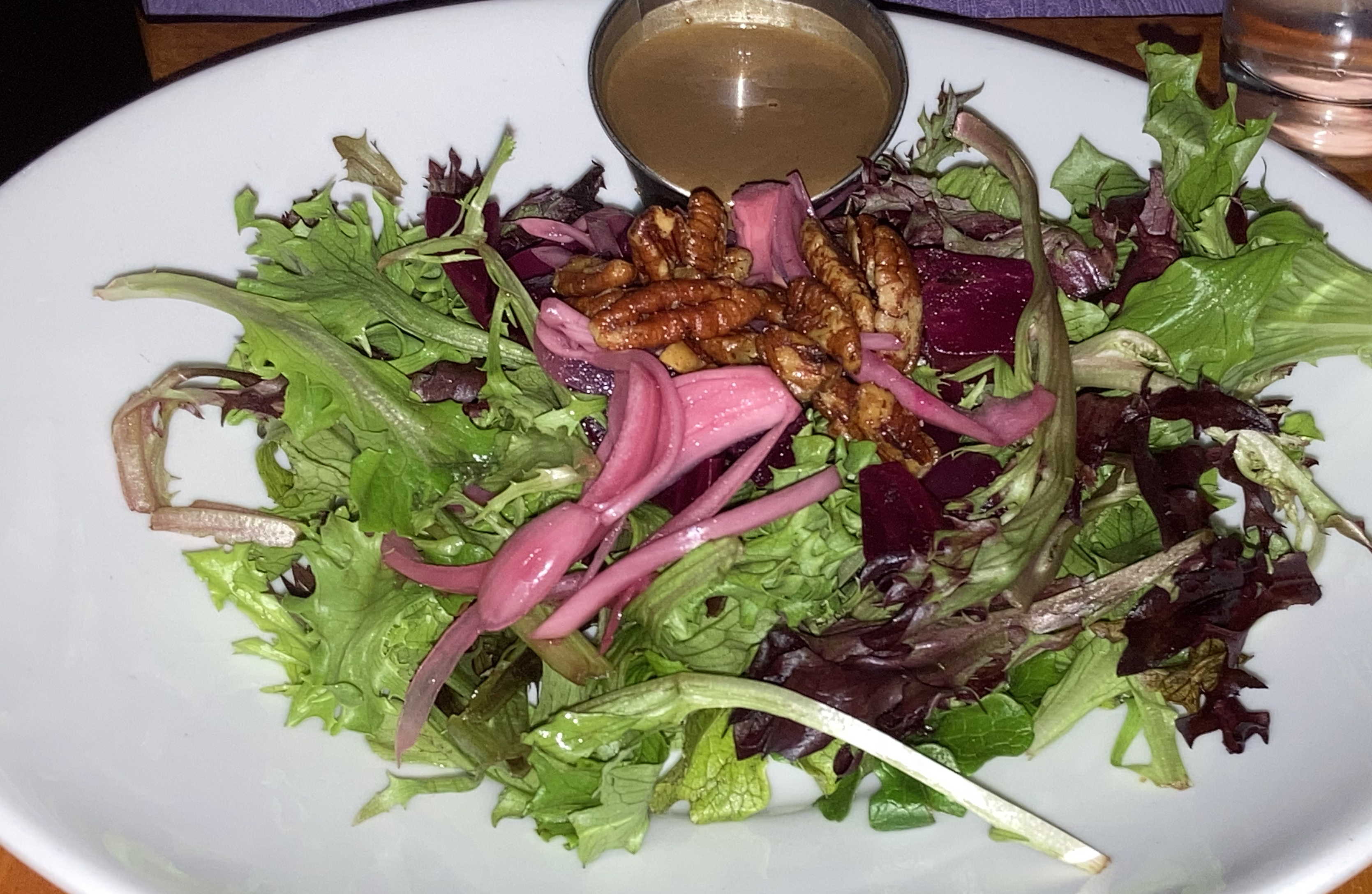 Unsurprisingly, given that the imminent closing has been announced, the restaurant was very busy for a Sunday evening. If they could only have been this busy for the past three years…but it was not to be. Our server, Chris, should have been overwhelmed by all the customers, but he managed to serve with his usual combination of efficiency and friendliness. Barbara started with the roasted beet salad of spinach & mixed greens, goat cheese, pickled red onion, candied pecans, balsamic dijon, and, of course, roasted beets; I started with the always amazing cheddar-and-scallion croquettes with smoked bacon aioli. Then came the equally-always-amazing fried jumbo shrimp with spicy mango dip for Barbara, and wood-grilled salmon with maple-mustard glaze, roasted potatoes, and haricots verts for me.