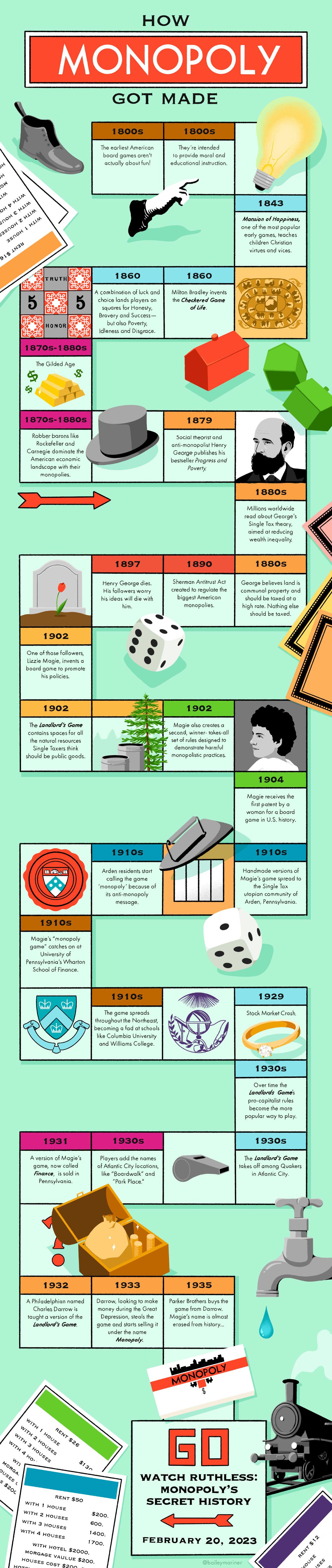 Anyhow, all of this made me leap at the opportunity to learn the true history of Monopoly on American Experience on PBS. The provocative title—“Ruthless: Monopoly’s Secret History”—turned out actually to be pretty honest marketing, not clickbait. Barbara assured me before we started watching that Monopoly had been invented by a woman. News to me, but it turned out to be true.