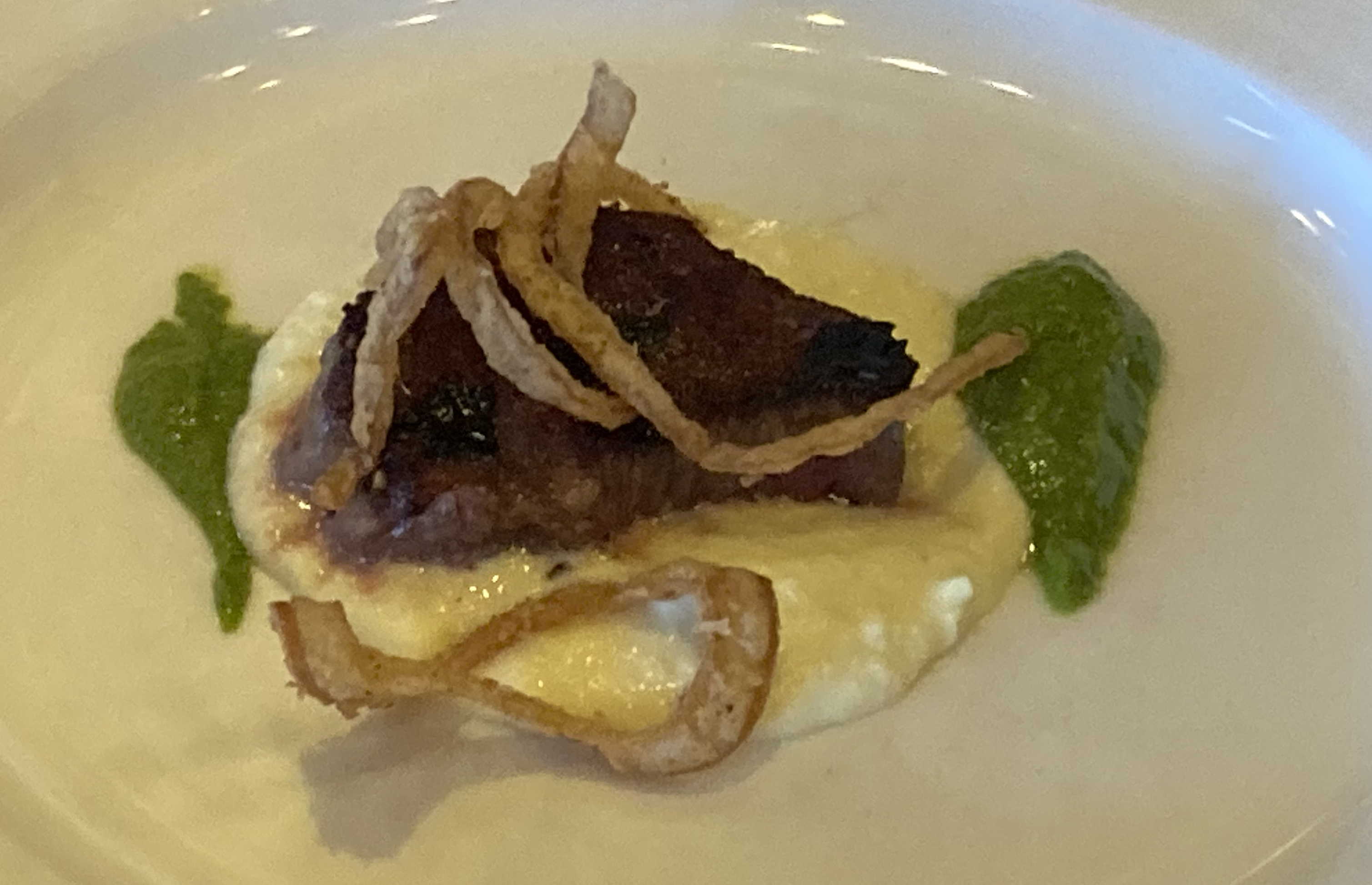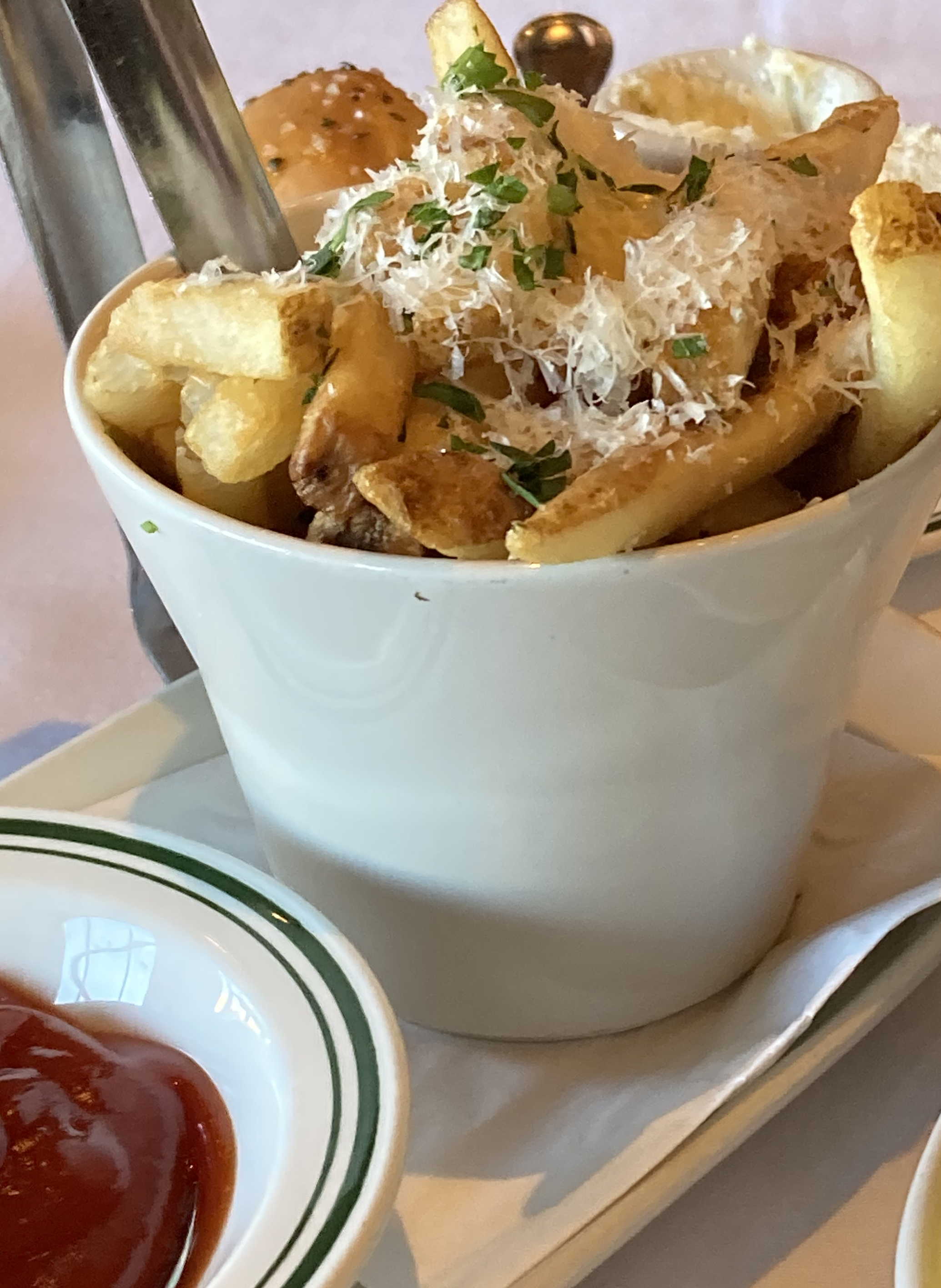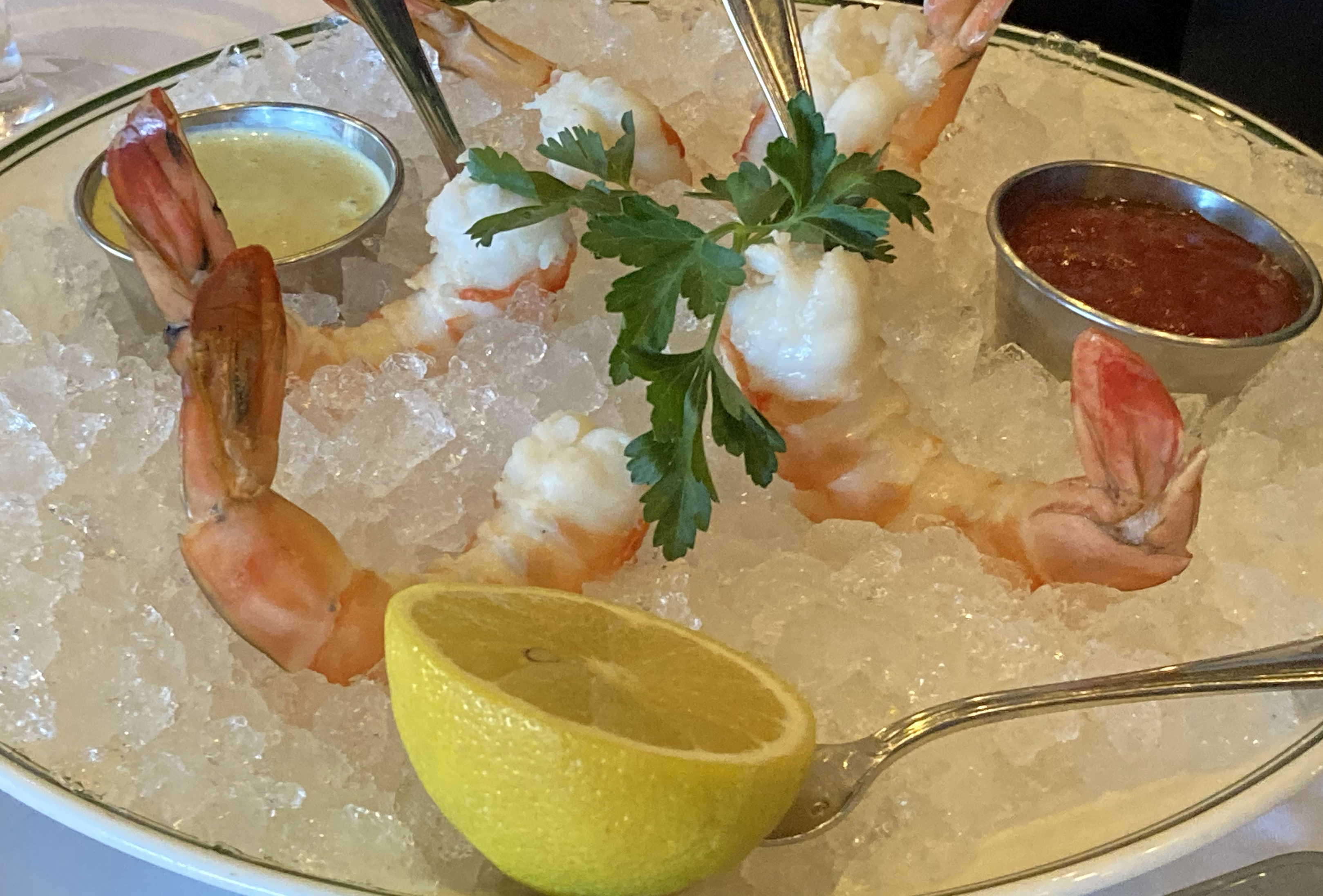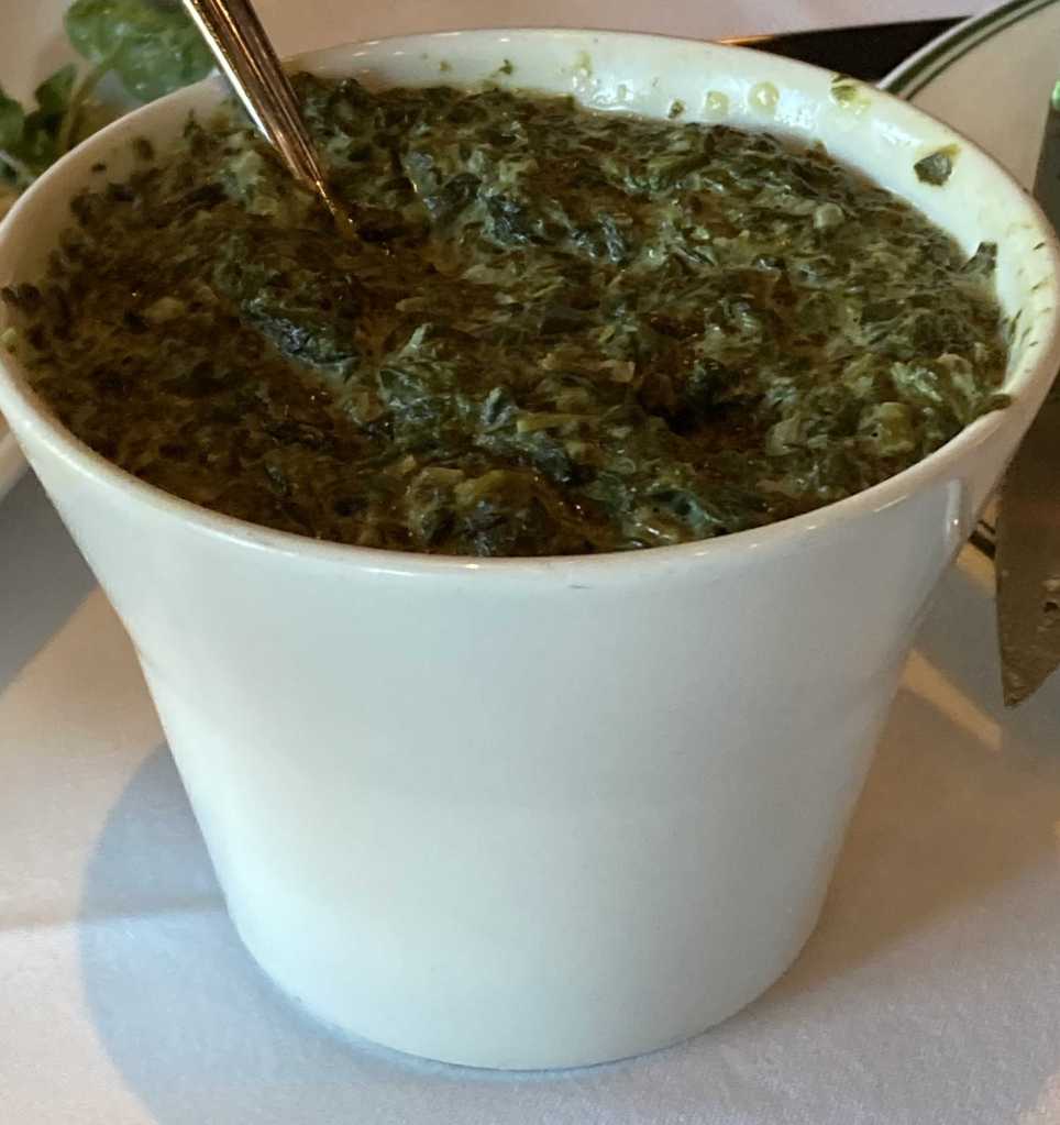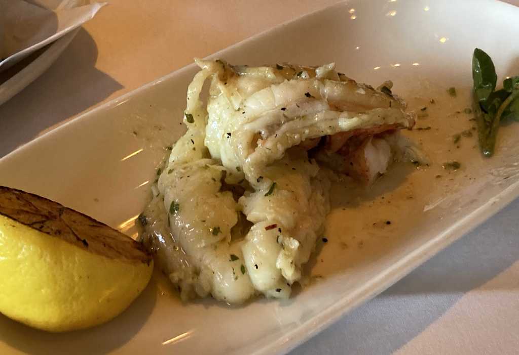 The verdict is that this time it was worthy of five stars, both for the food and for the service. Price is another matter (see below). We started with an unexpected amuse-bouche of a small piece of rare filet mignon with chimichurri sauce and onion strings. It was excellent in all respects. Then Barbara had a shrimp cocktail of three truly jumbo shrimp (there actually were five, but she gave one to me and took one home), cooked and served perfectly. That was followed by two lobster tails, truffled french fries with grated parmesan, and creamed spinach. She reports that the fries were good and the spinach was first-rate.