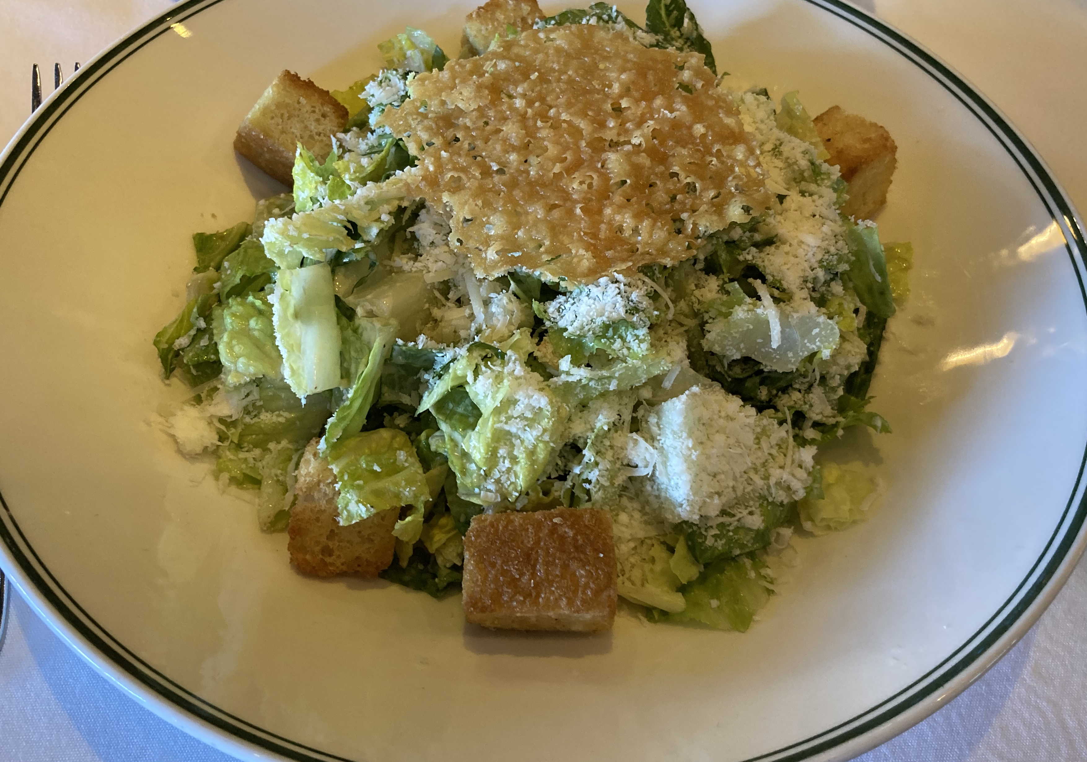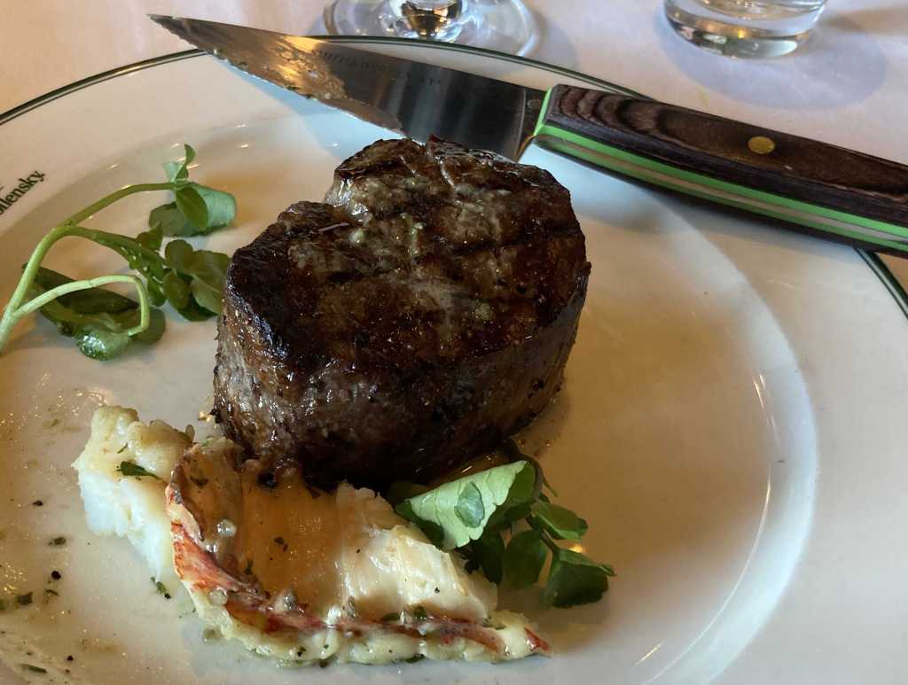 I started with a gigantic Caesar salad, crisp and fresh, with a parmesan frico, otherwise traditional (meaning no anchovies, unfortunately, but it was just fine and I had to take half of it home). That was followed by a filet mignon, prepared exactly as ordered, i.e. rare, with a lobster tail on the side. I had to take approximately 37% of the filet home.