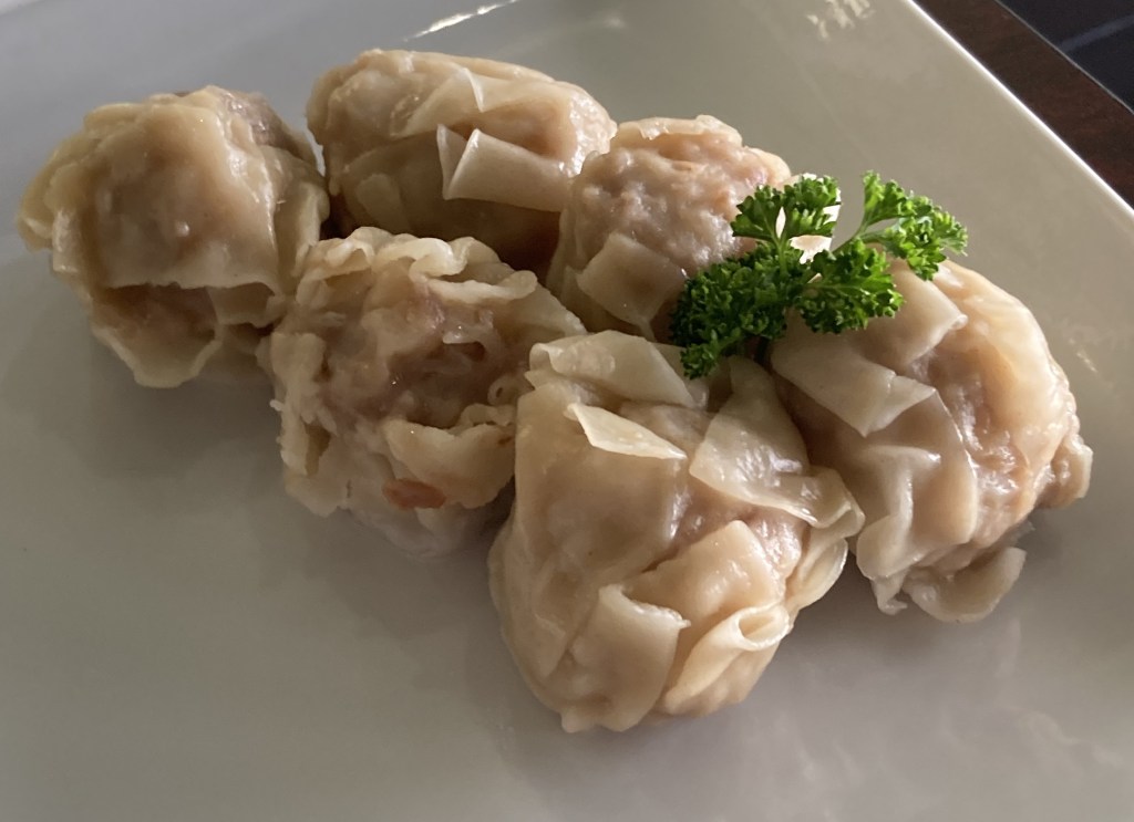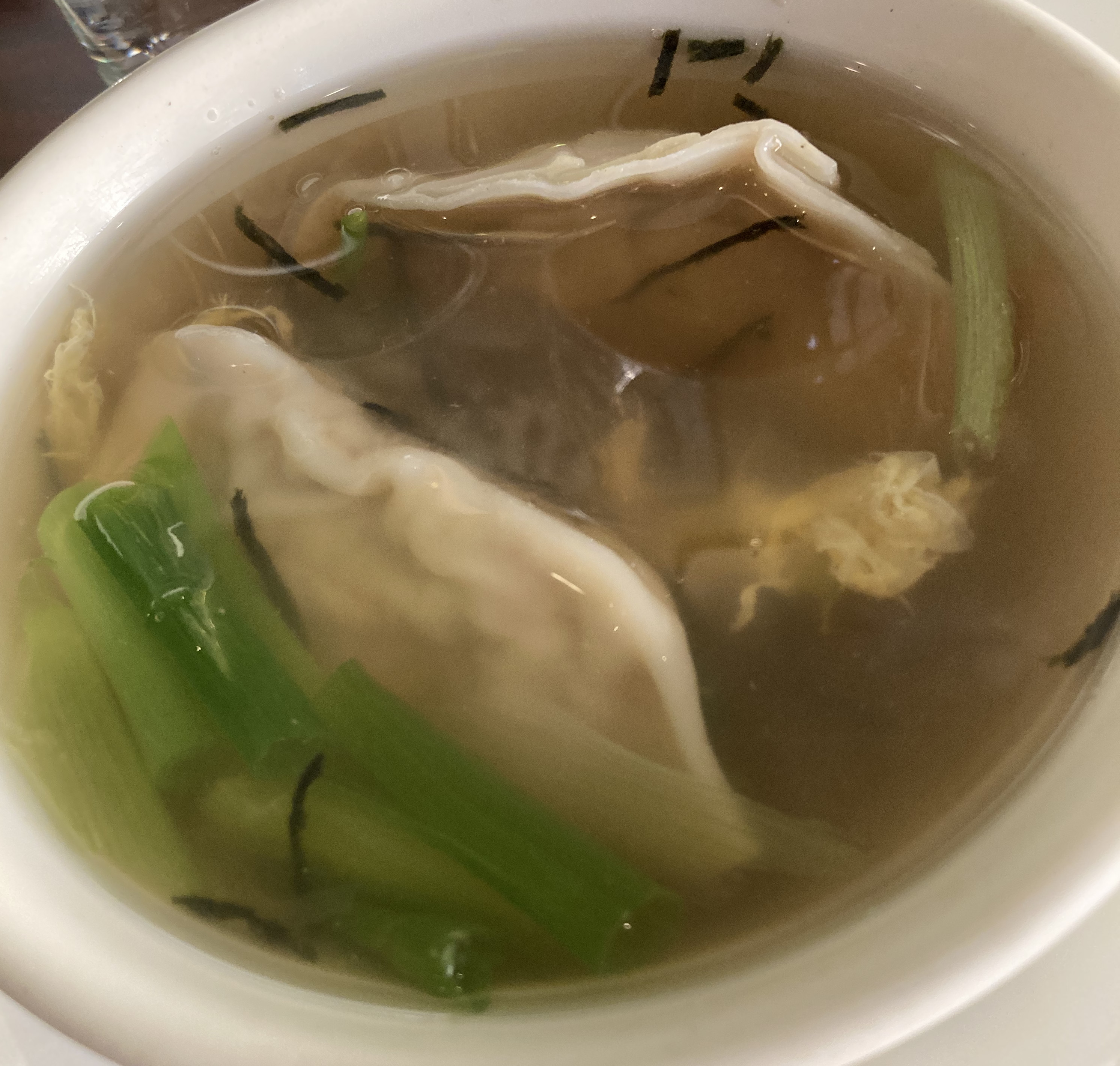 - Korean beef dumpling soup with egg, clear potato noodles and scallions