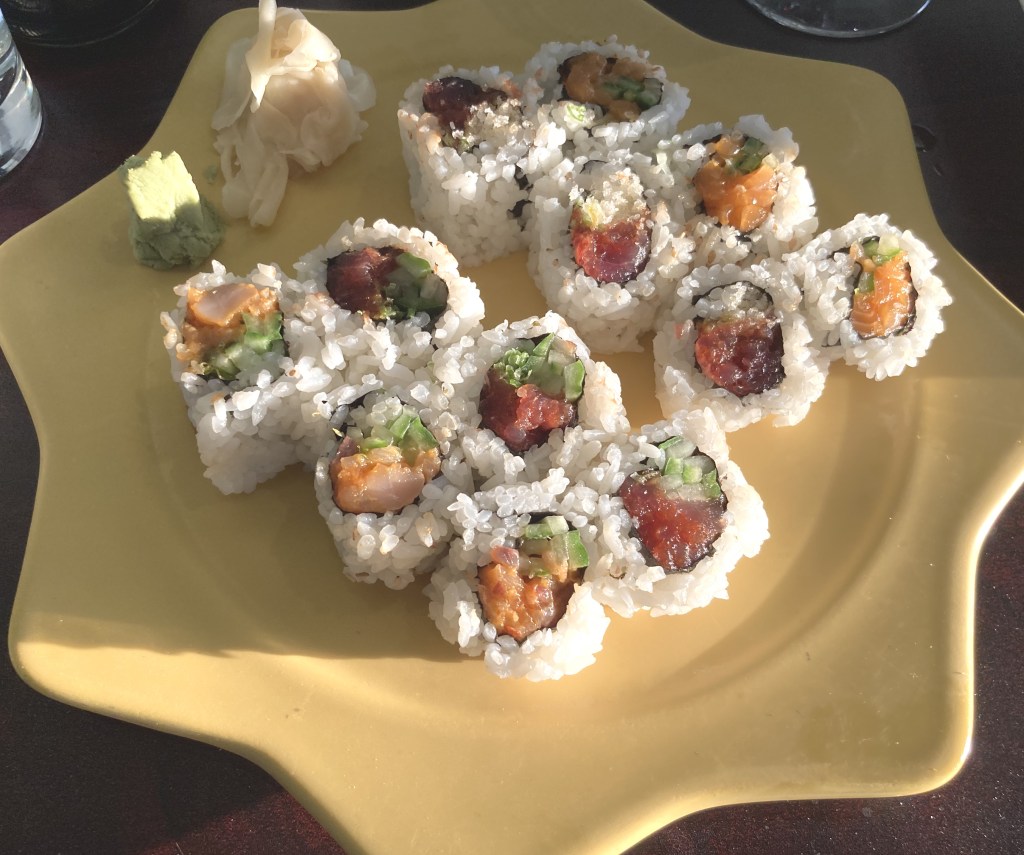 - spicy maki combo on a cool plate shaped like an 8-pointed star [think of the opportunities for geometry problems!]