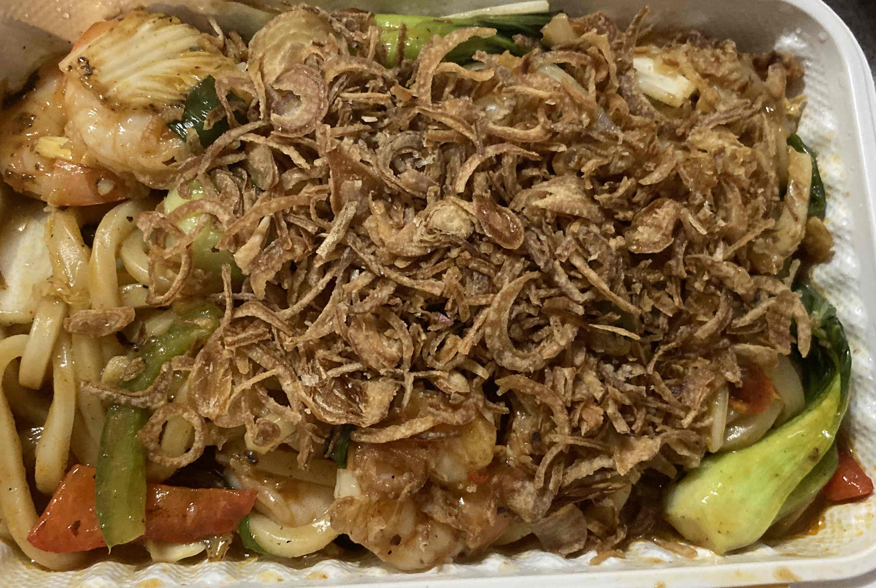 - The star of the show: (very) spicy black-bean garlic udon, stir-fried with bok choy, bell pepper, onion, scallion, and crispy fried shallots in spicy and garlicky black-bean sauce (yum, yum, five stars for this one…when they say it’s spicy they mean it).