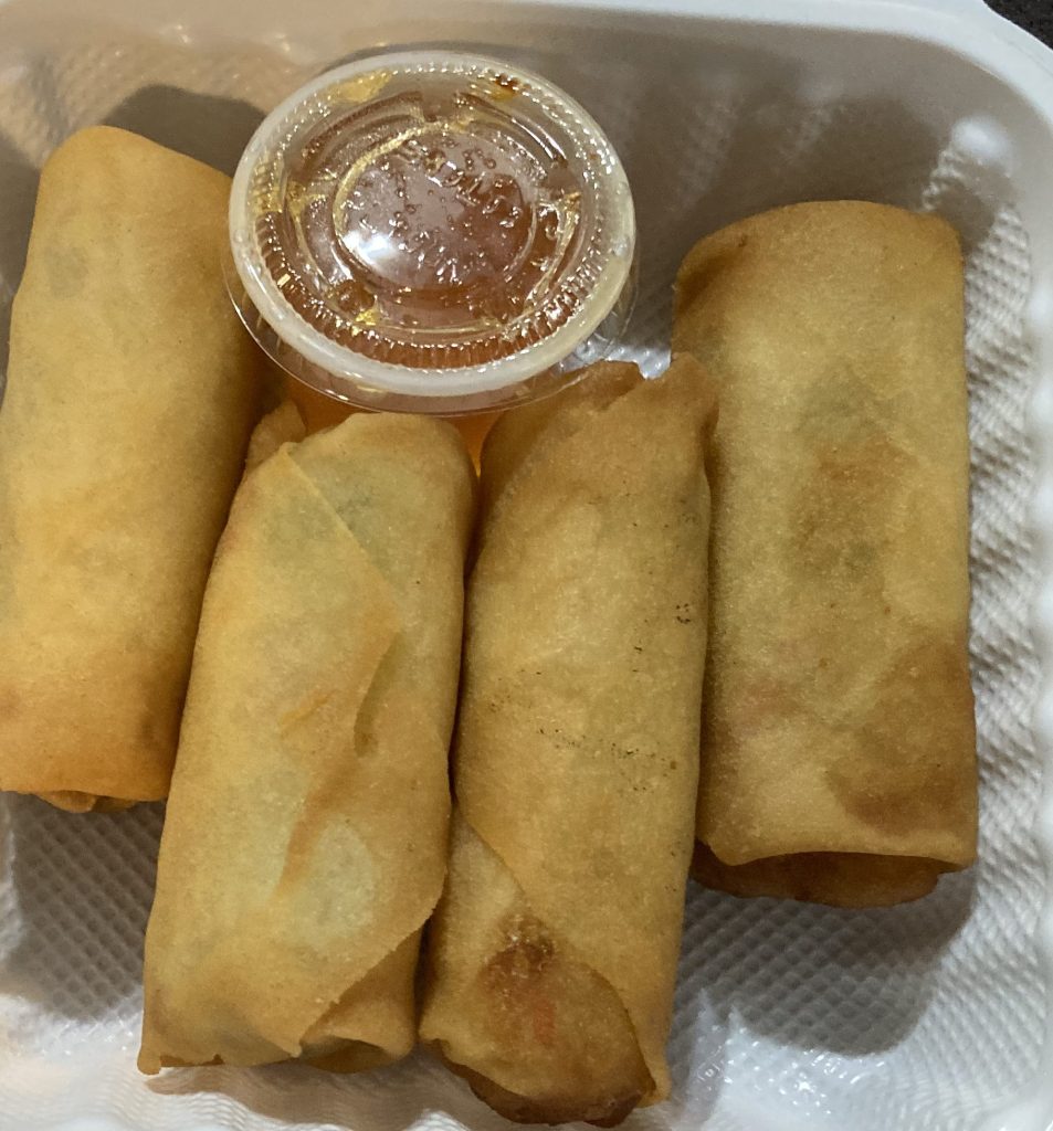 - Crispy veggie spring rolls, served with sweet sauce (not very exciting, but still delicious).