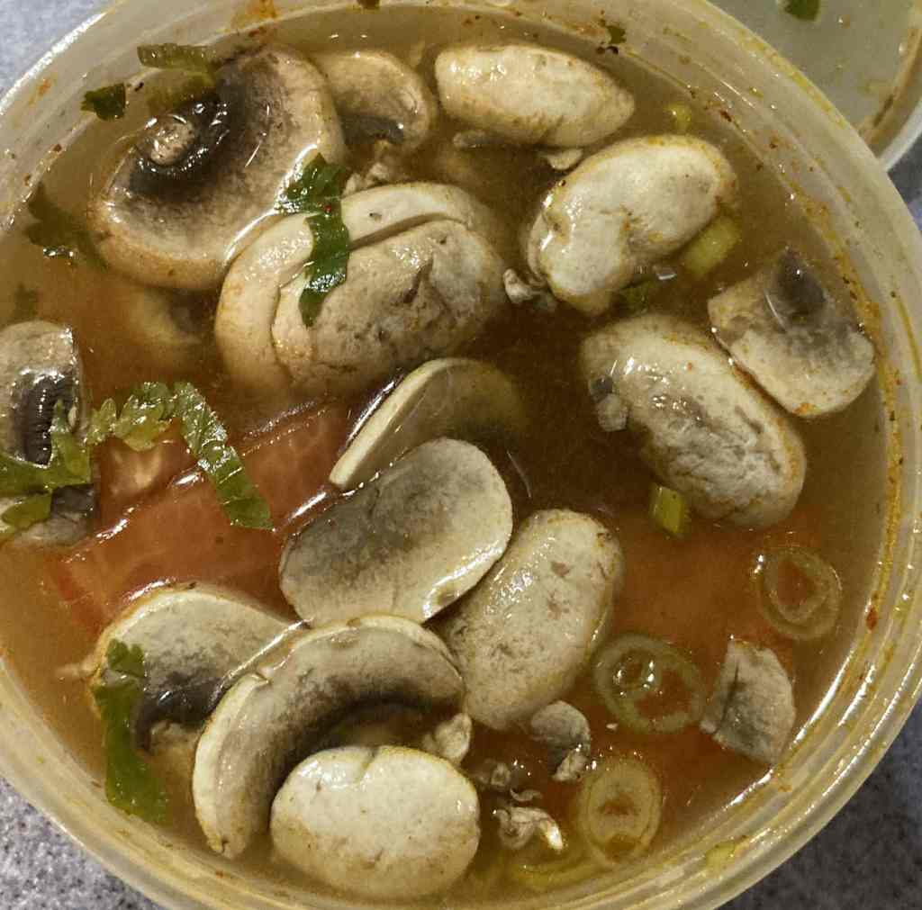 - Tom yum soup: hot and sour soup with shrimp, lemongrass, lime juice, tomato, mushroom, scallion, cilantro (an old reliable that I order from any Thai restaurant I go to).