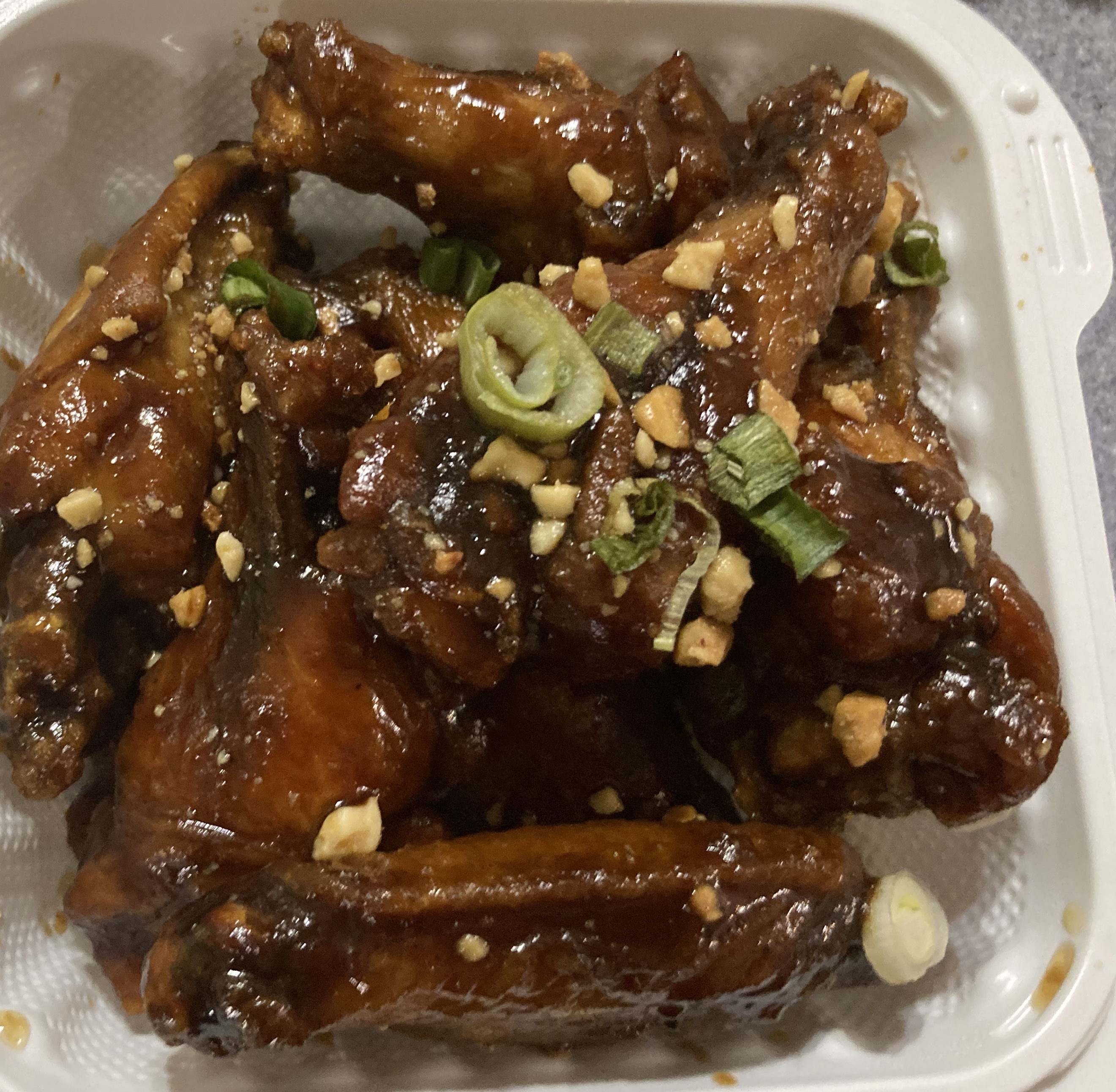 - JTK wings glazed with sweet JTK sauce, topped with ground peanuts and scallion (always a standout, the Platonic ideal of fried chicken wings).