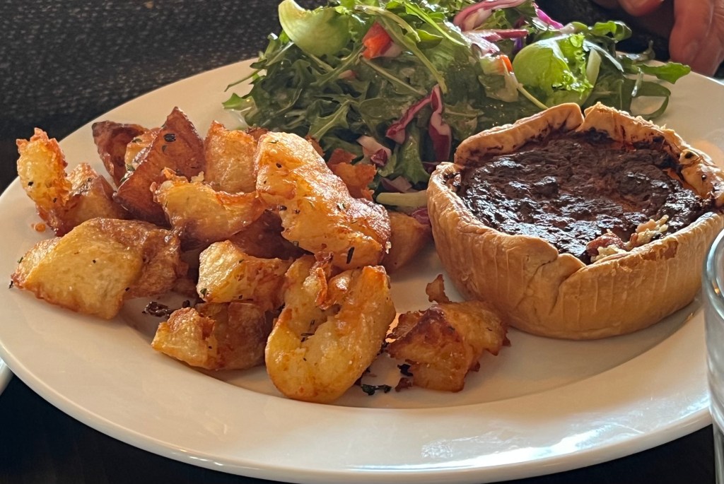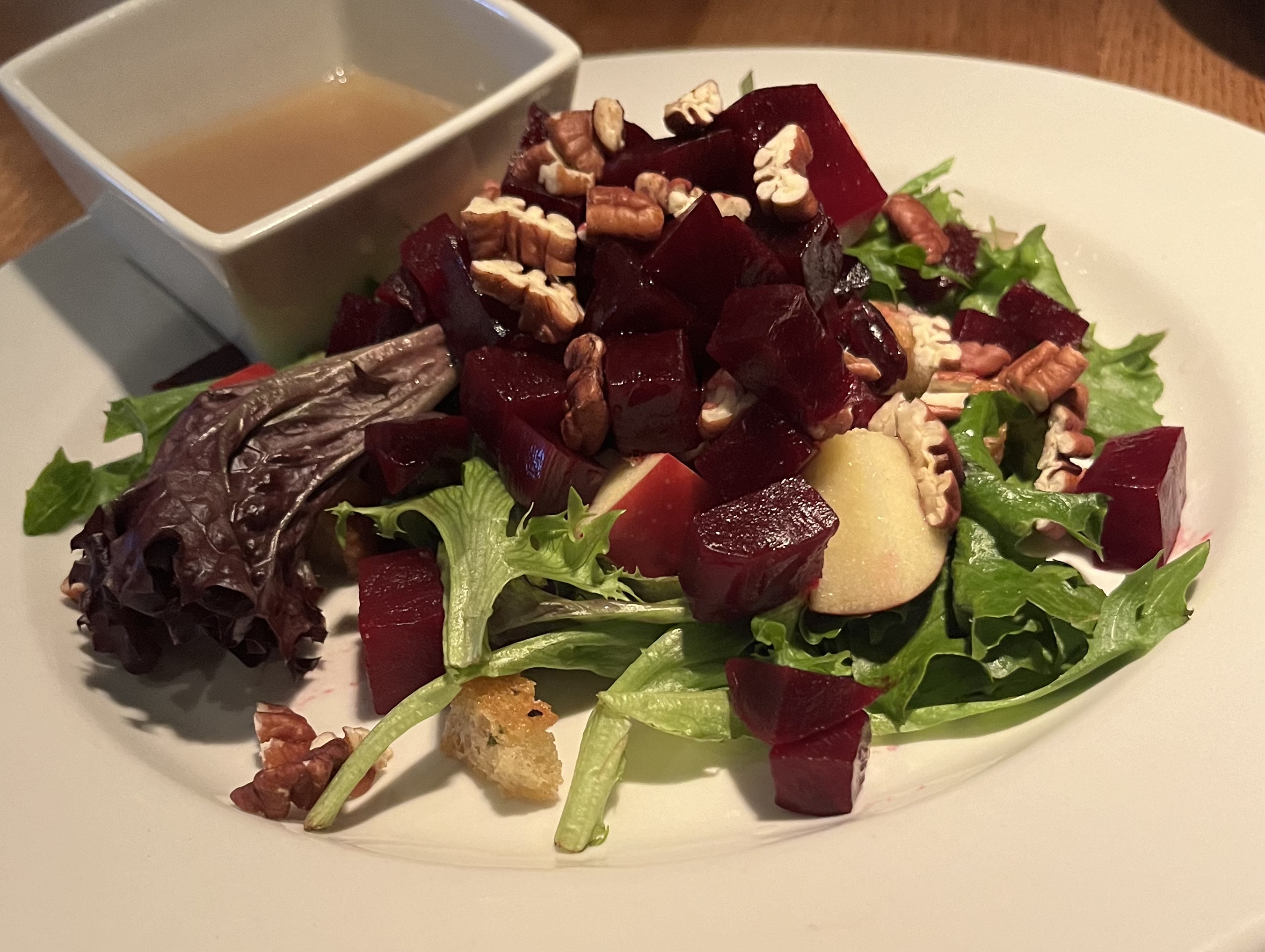 I’ve already written many times about Tavolo, so just a word about one new item (new to Barbara and me, not new to the menu). That’s the Panzanella Salad, described on the menu as “pecans, roasted beets, dried cranberries, apple, mixed greens, house croutons, lavender vinaigrette.” Being allergic to tree nuts, I can’t eat it, but Barbara reports that it was delicious.