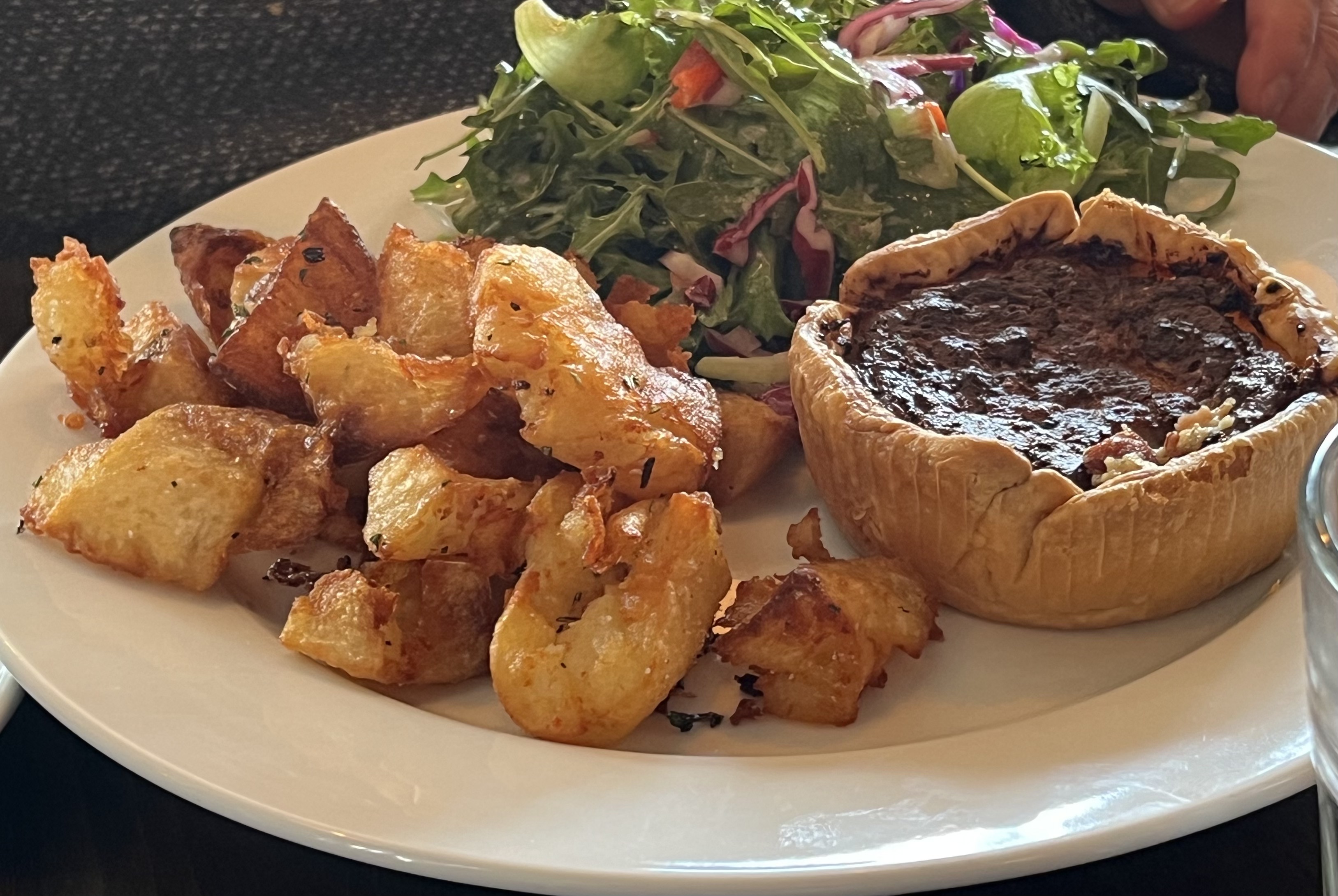 - Crostata Romana Carbonara (“savory tart, pancetta, onions, eggs, parmigiana, caciotta cheese, mixed greens, roasted potatoes”).
