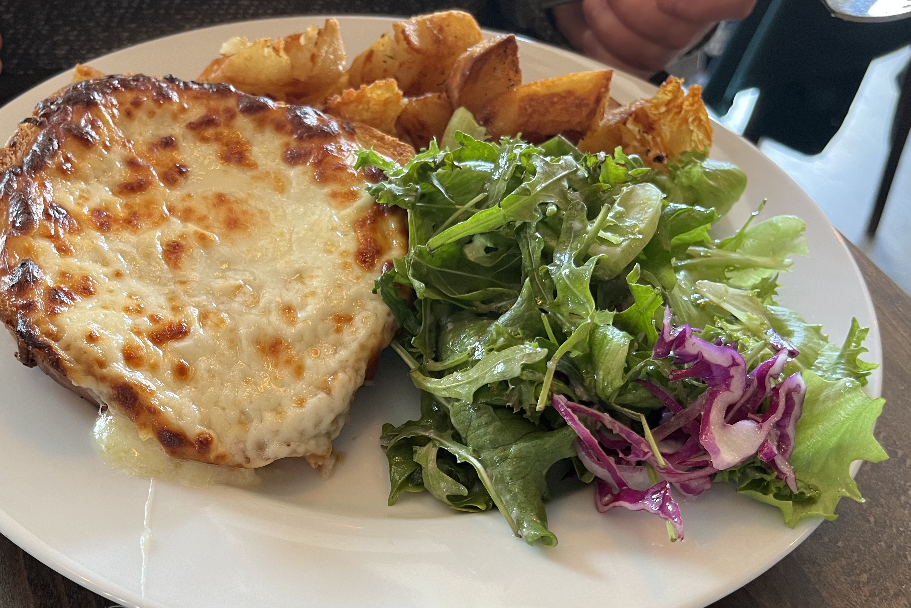 - Italian Cròc Monsieur (”baked bread with cotto ham, mozzarella, besciamella sauce, mixed greens”).