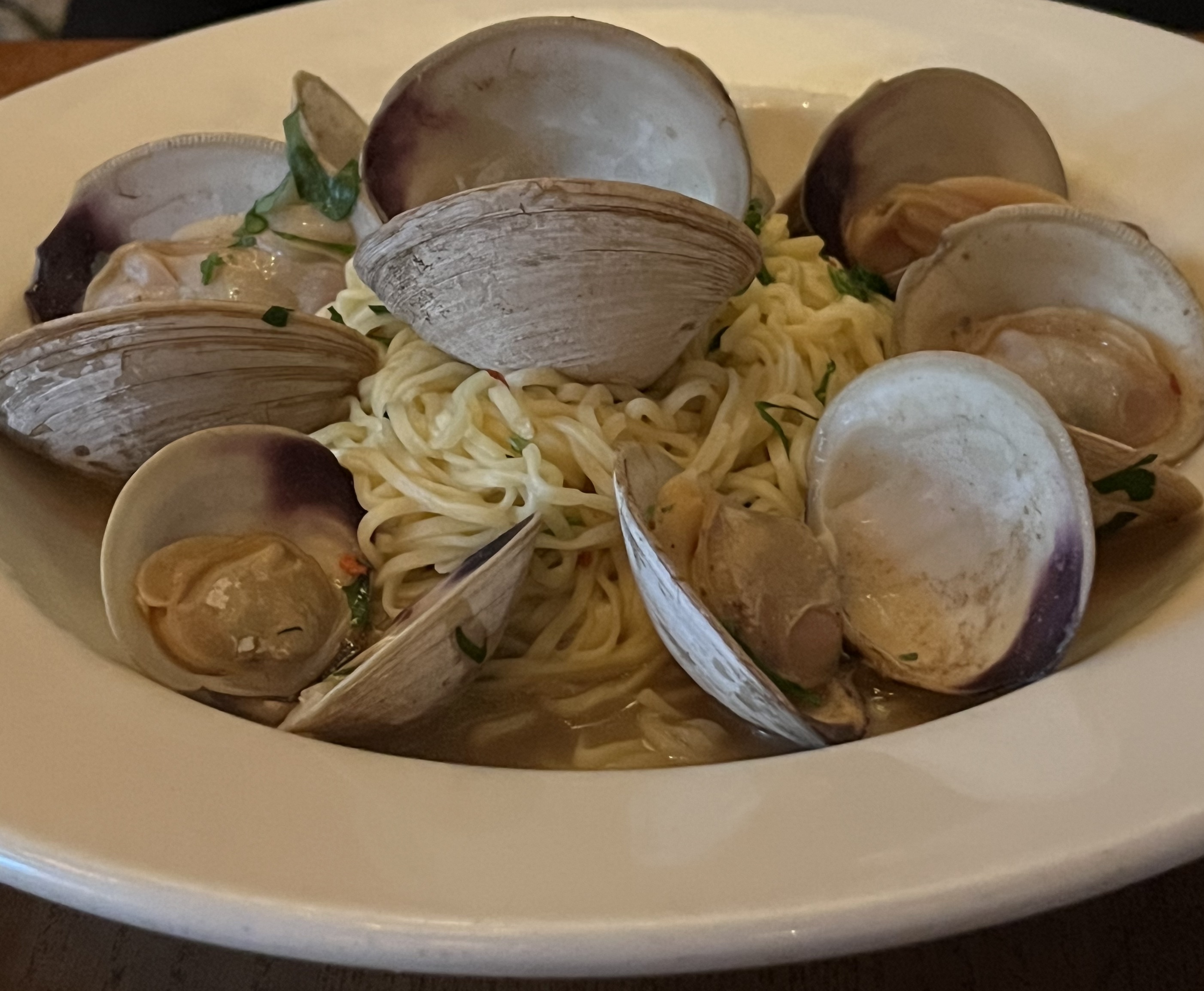 But none for me. (“Why not?” you ask. Because I don’t like clams. If I did, I would order this dish, but that wouldn’t be a good idea, since I don’t like them. For some unknown reason, I like shrimp and mussels but not clams or oysters. You explain it.)