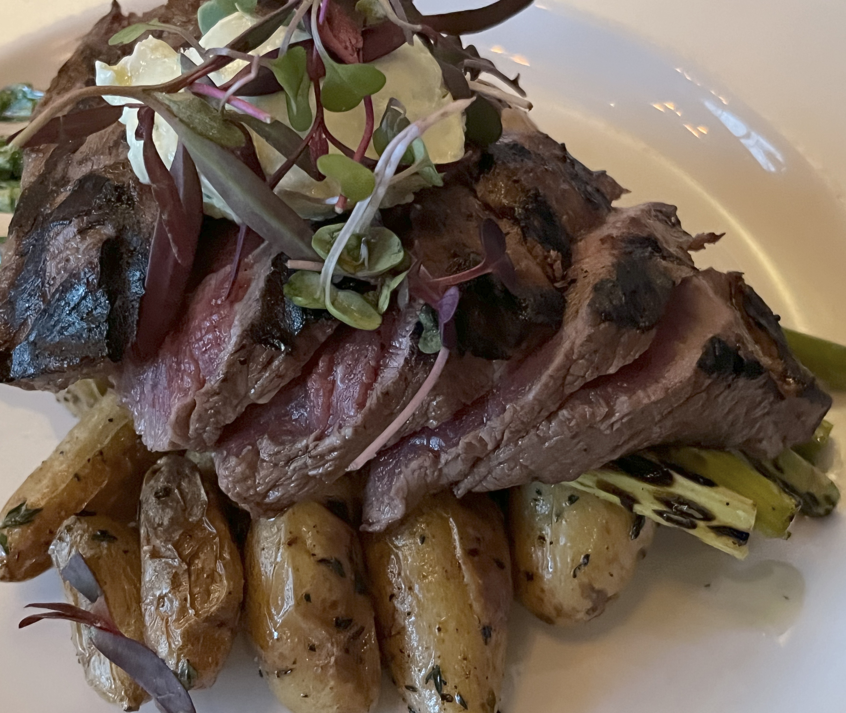 Anyway, Barbara said these were delicious. I will take her word for it, but my choice was much better (not my biased opinion, of course, just an objective observation): hangar steak ordered rare, with grilled asparagus and fingerling potatoes.