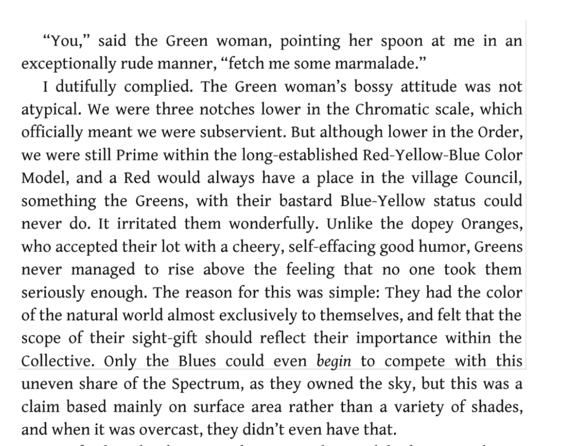 OK, I’ve kept you in suspense long enough. The book I recently finished reading is Shades of Grey — no, that’s not the book you may be thinking of; it’s a dystopian novel, first in a new series by Jasper Fforde. It takes place in a future England, some hundreds of years in the future, in an unspecified location. It may be science fiction. Or it might be fantasy. Because of an (unspecified) Something That Happened, most modern technology is forbidden. Ability to perceive colors is a determiner of social class — not only the particular colors but also their vividness and clarity. At the top of the chain are the purples, i.e. those who can perceive purple, followed by the blues, the greens, and so forth. Totally colorblind people, who see no colors and everything looks gray, are at the bottom of society. Friendships between colors are discouraged. In any case, there is a maximum number of friends you can have. Virtually everything is low-tech, although slow trains and a very few cars are allowed.