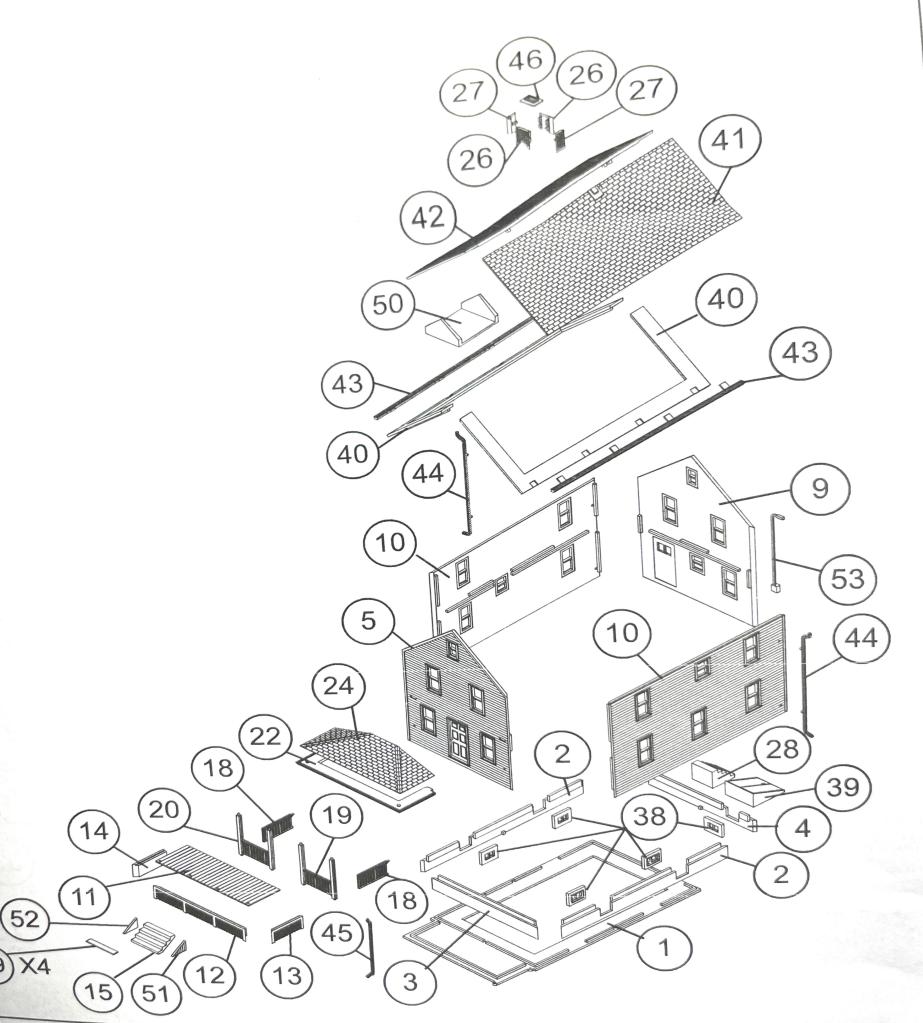 Note that all these pieces came from a kit, which I showed the first week. The kit contains sprues; each sprue contains a variety of elements attached to it, such as the four shown here; and some elements, such as windows, aren’t attached to anything. Instructions usually — but not always — include some explanatory text. And they usually — but not always — include some pictures. For example: