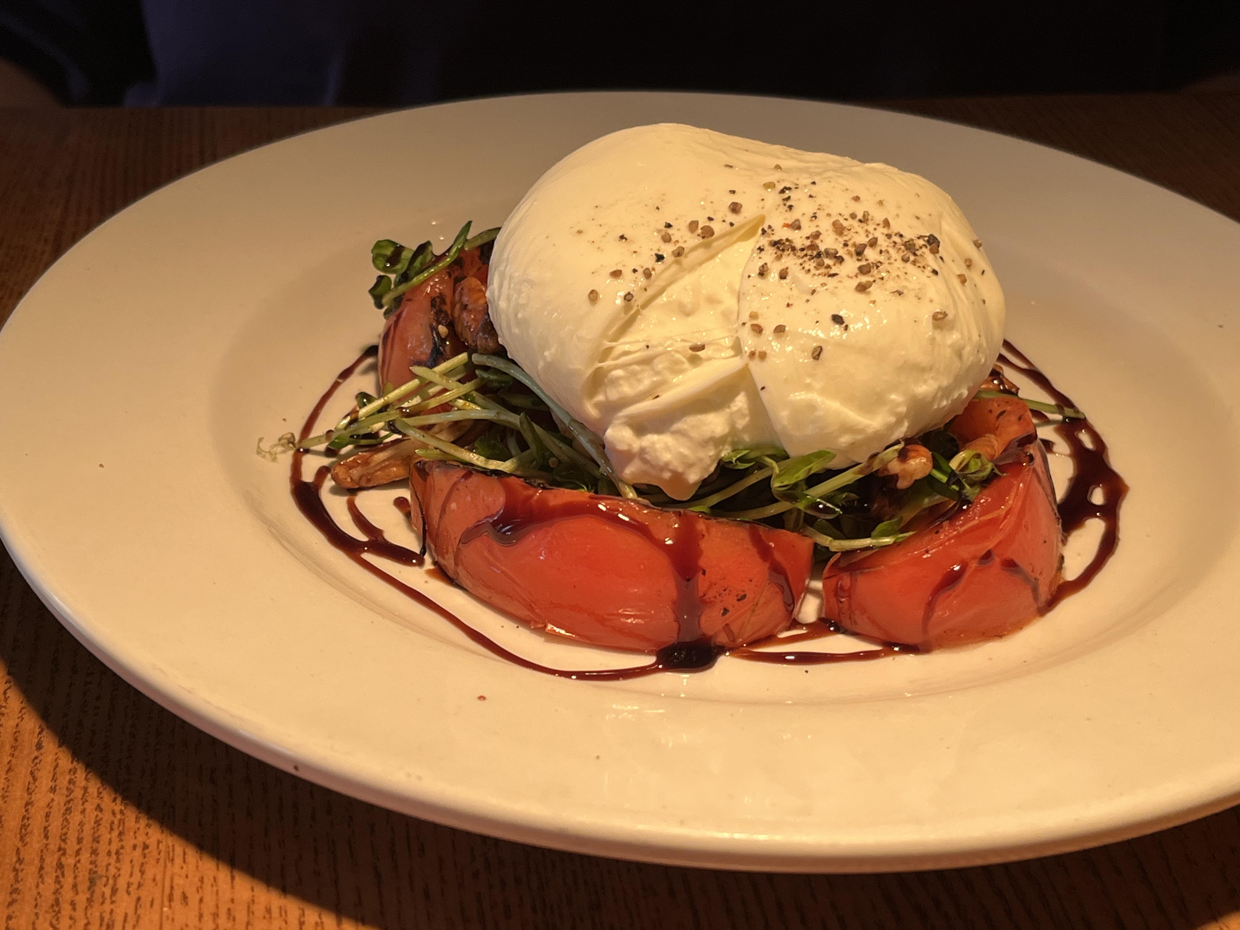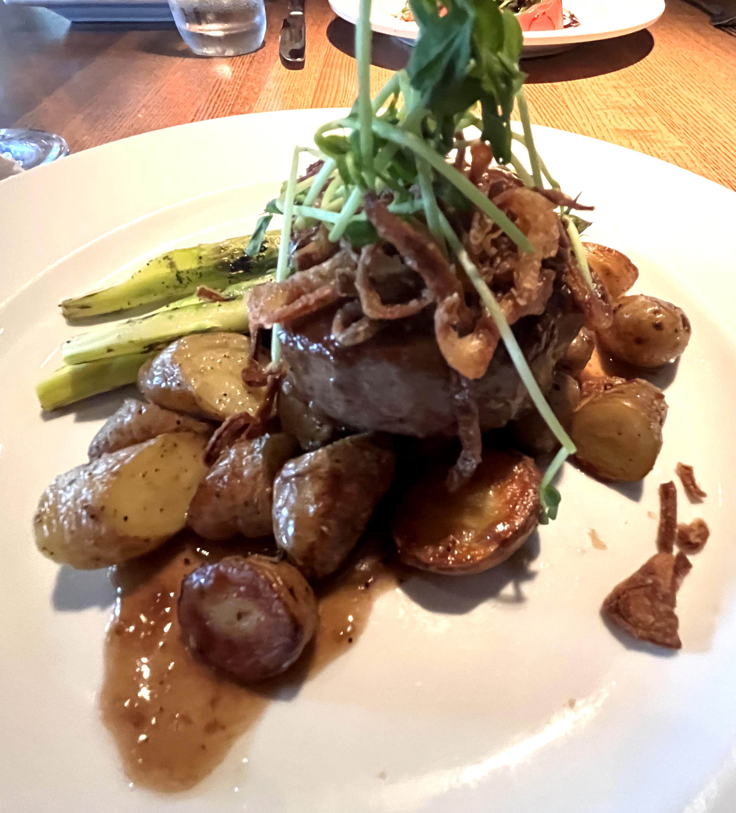No appetizers this time, since we had to save room for dessert. Barbara chose the new incarnation of the chef’s burrata, which came with grilled & chilled tomato, pea tendril salad, pecans, and aged balsamic. Instead of the listed mortadella with pistachios, she paired it with rosemary focaccia. I was torn between the boneless pork chop milanese, which I have had before and will gladly order again, and the new-to-the-menu seared filet mignon. I chose the latter, which came perfectly cooked (rare as ordered), accompanied by grilled asparagus, roasted fingerling potatoes, crispy shallots, and red wine demi.