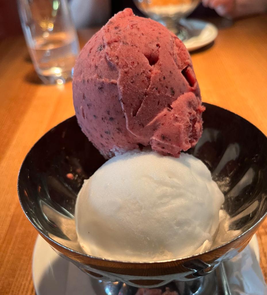 And what about the above-mentioned dessert, I hear you ask? We were both drawn to the sorbet choices. Barbara picked blueberry and peach; I picked blueberry and lemon. An excellent end to a delicious meal, with equally excellent service.