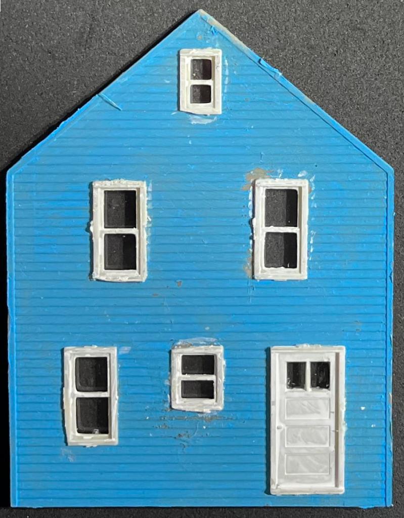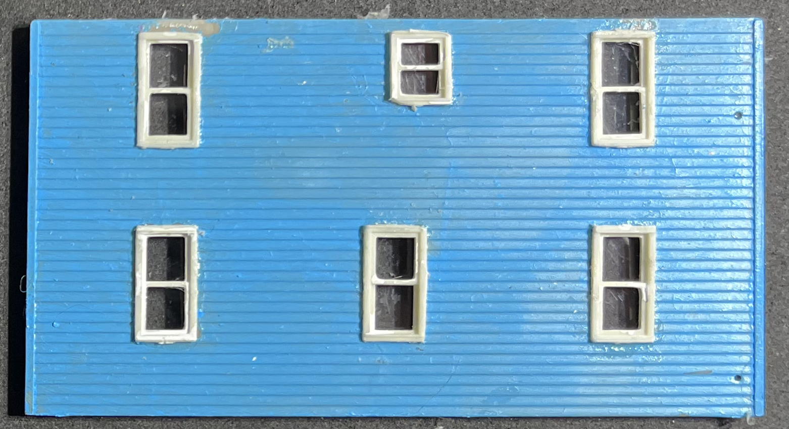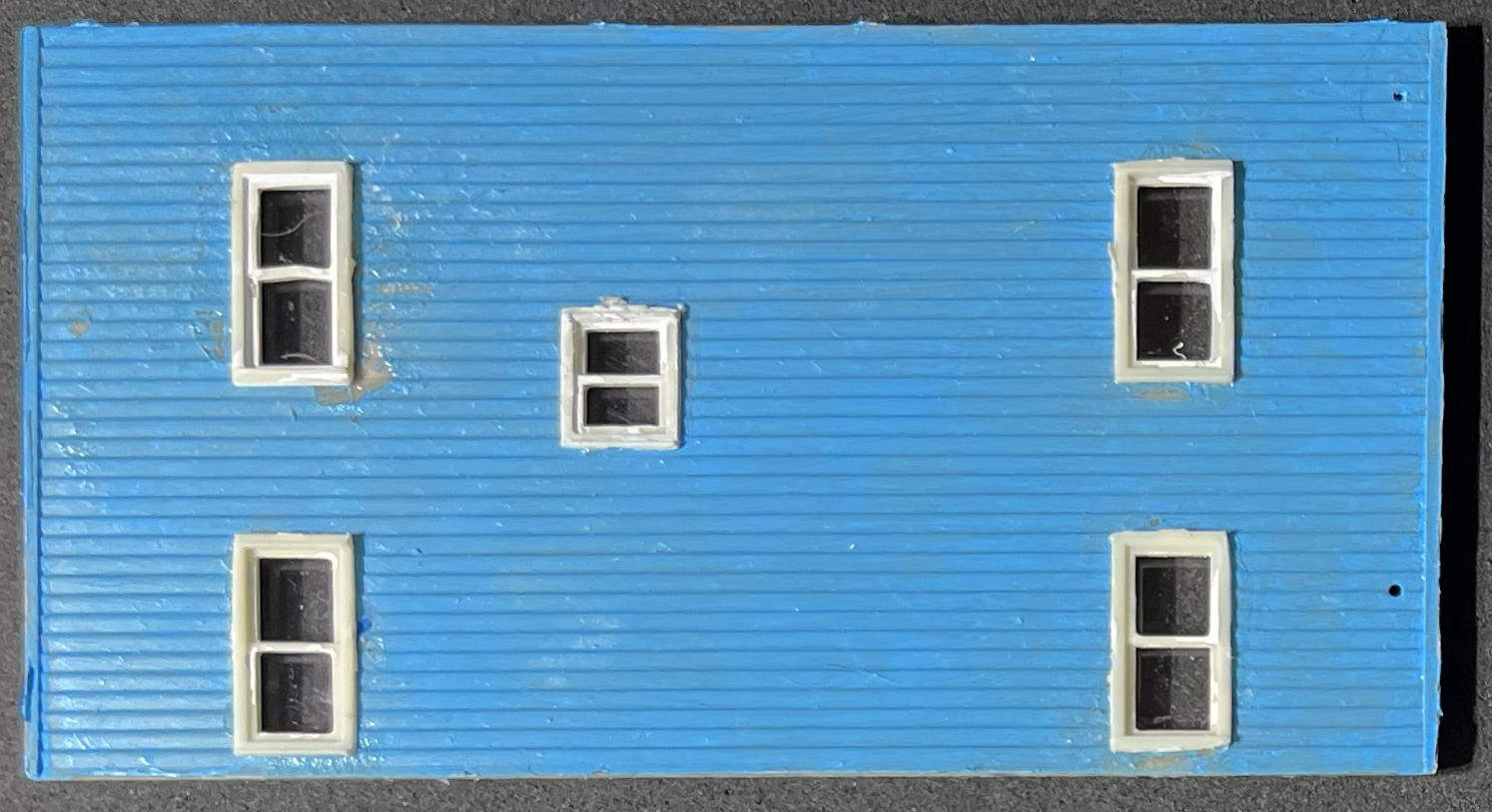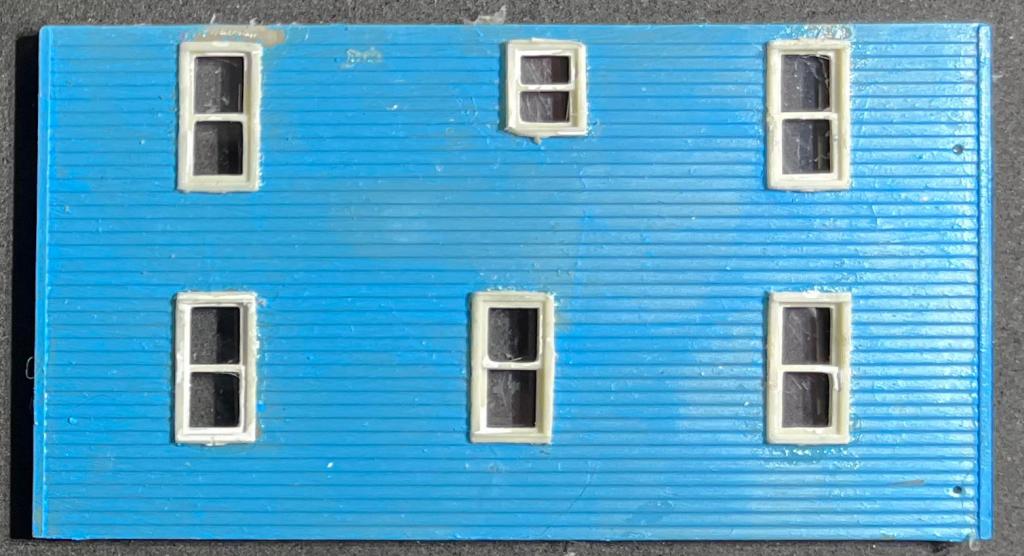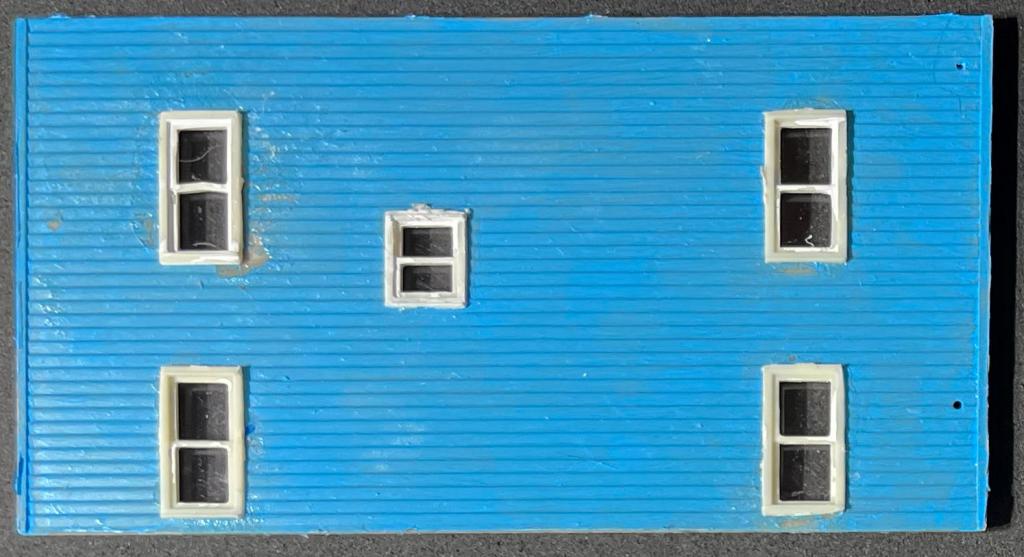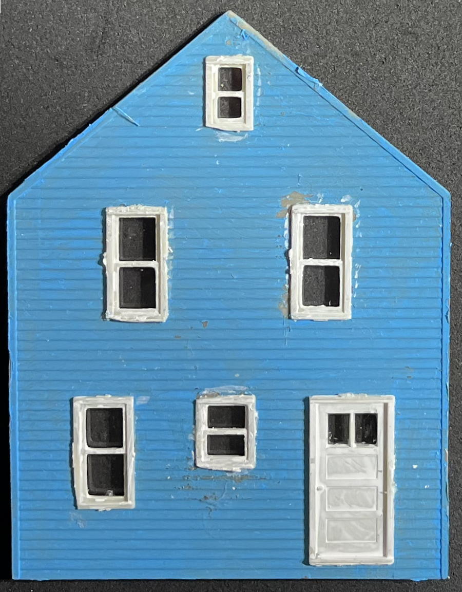 First we have the current state of the front wall of the house. Note that the window frames now have windows installed (all cut from a single sheet of acetate — probably hard to see, since they’re transparent!) and three of them have drapes.