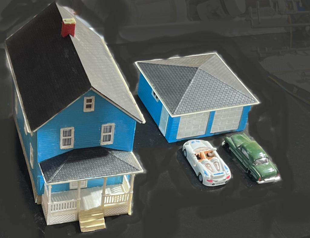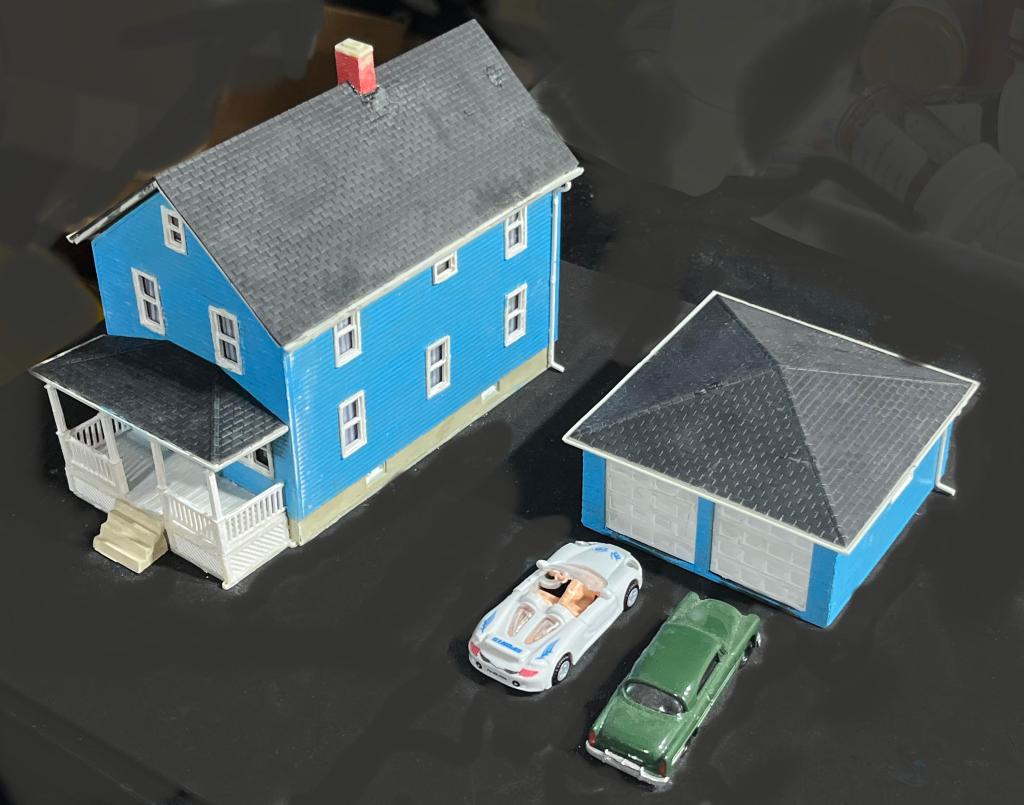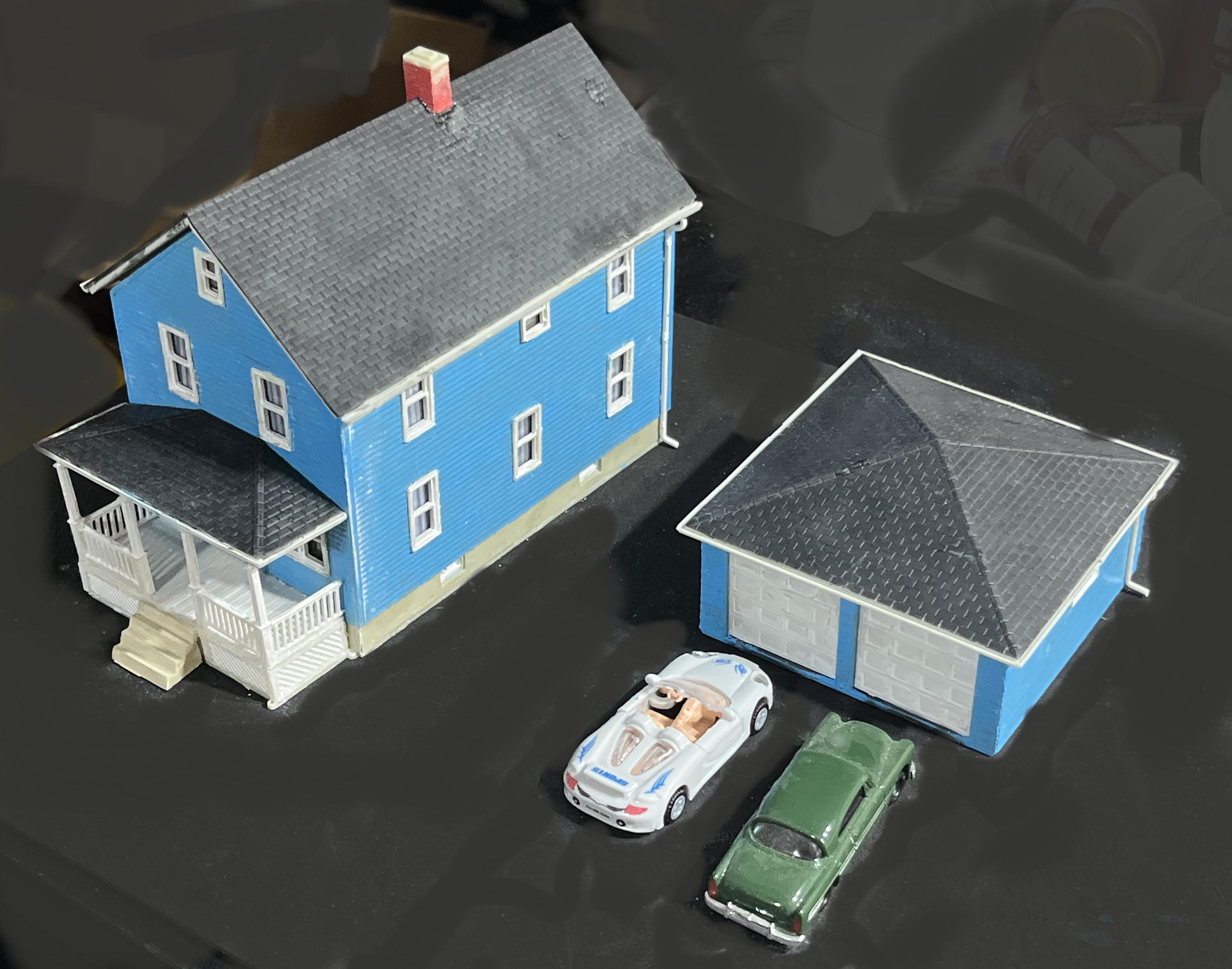 It will take a few more weeks before we can see them in context, as the surrounding neighborhood isn’t quite complete (it’s missing some streets and most of the landscaping). When all that is ready, the house will also include a driveway, a front lawn, a path from the house to the garage (not covered — sorry, Brian!), a path to the street, and perhaps grandma sitting in her rocking chair on the front porch. Note that although this will be part of a model railroad layout, there will be no tracks close to the Goldbergs’ house. You’ll see why in a subsequent post when I outline all the different neighborhoods in Rose City.
