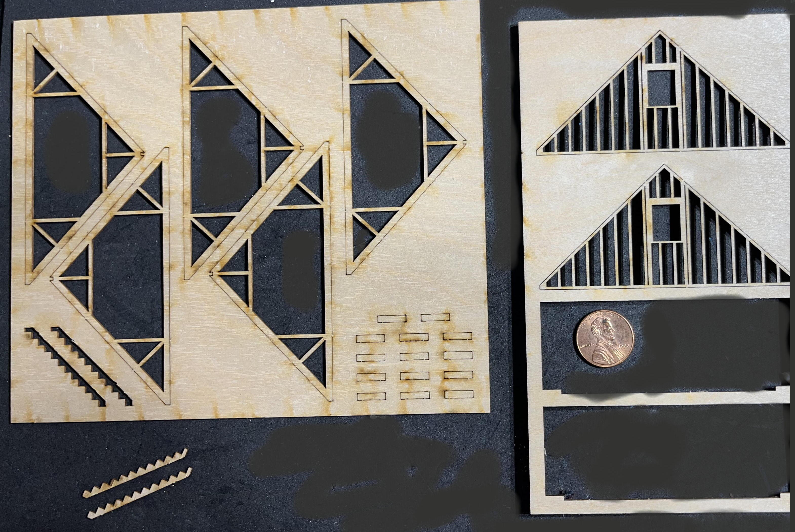 Now that my model railroad includes a pre-fab house built from a standard kit, which I showed as a work in progress over ten weeks, it’s time to experiment with a different approach: a compromise between a standard kit and building from scratch. While true building from scratch would involve taking sheets of styrene, strips of wood, etc., and going from there, the compromise construction uses a kit that doesn’t contain entire pre-fab walls and so forth. Showing is better than telling, so let’s look at a couple of the components contained in the box: