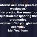 Found in the INTJ group on Facebook: Interviewer: What is your greatest weakness? Me: Interpreting the semantics of a question but ignoring the pragmatics. Interviewer: Can you give me an example? Me: Yes, I can.