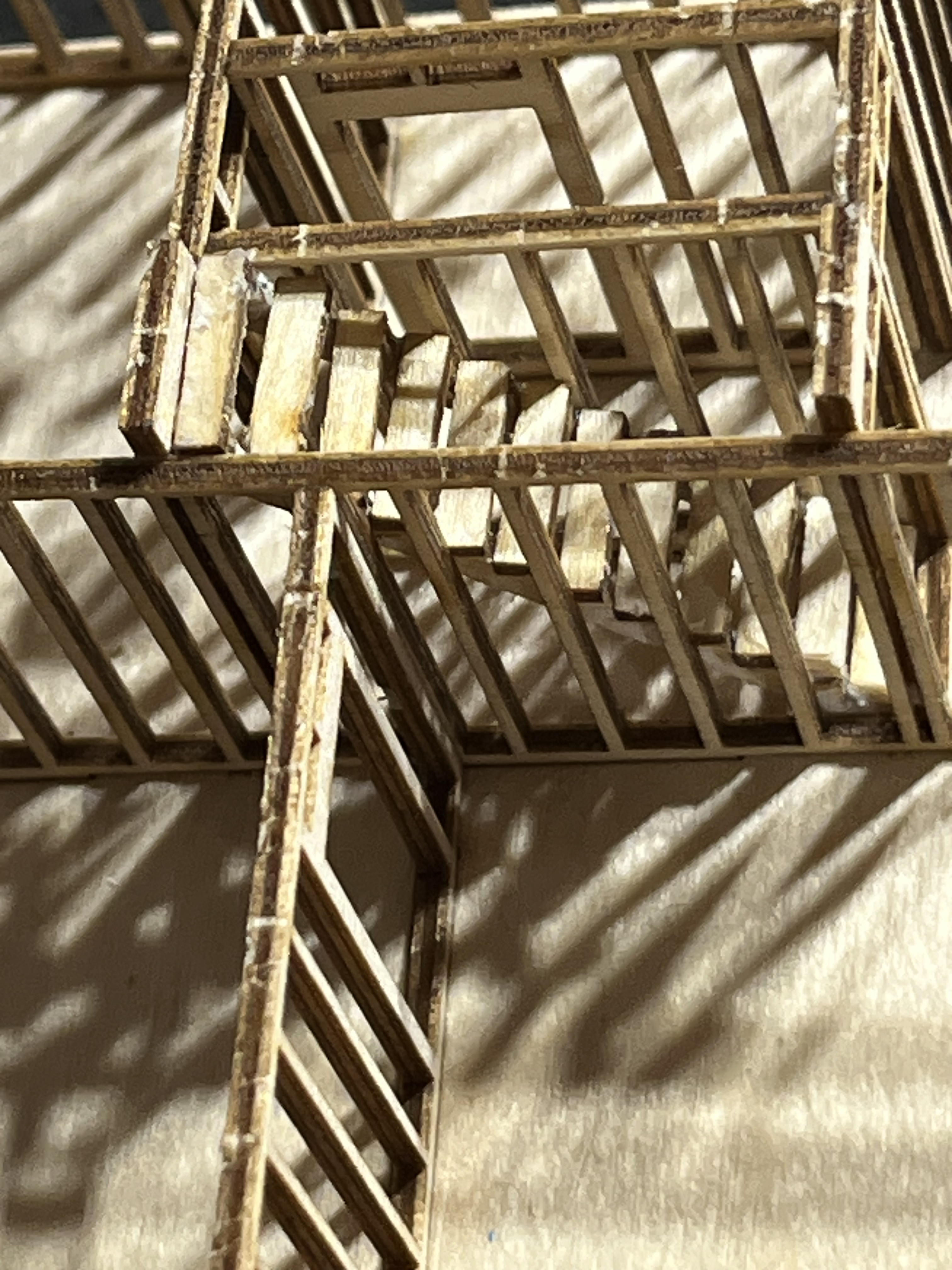 There is absolutely no way that I would have been able to do this myself, largely because of the staircase! Fortunately Meredith has the necessary dexterity that I lack. But first she had to solve the problem of how to keep holding the partially built staircase while she inserted each new step and lined it up perfectly in all three dimensions.