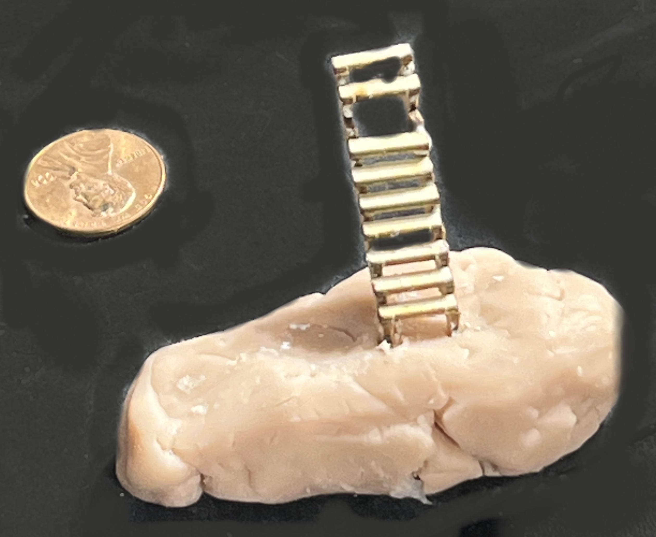 “Aha!” the solution presented itself. Meredith took a hunk of polymer clay, which she happened to have handy (as one does); inserted at an angle the initial set of components, which now were temporarily but firmly anchored; and carefully but firmly positioned each step where it needed to go. Somehow she lined each one up perfectly in all three dimensions, which, as I said above, I could never have done.