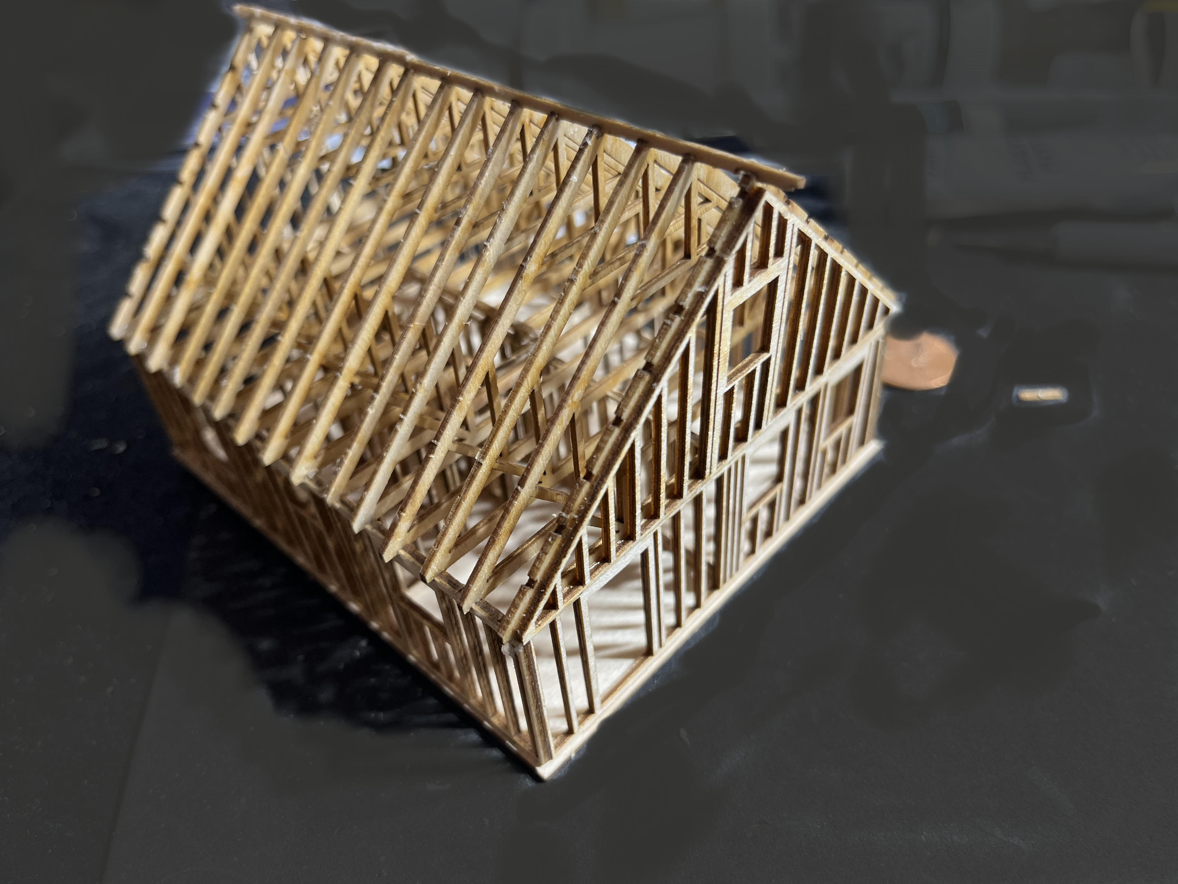 But I digress. This post is actually about model railroad structures, which neither Sappho nor Salinger was writing about, though the connection isn’t an accident. This post continues our series in which Meredith and I collaborate in building a kit that will end up as a “house under construction,” not a standard completed house. (When I say collaborate, I mean that she builds while I watch.) That means that when it is completed it won’t be complete.