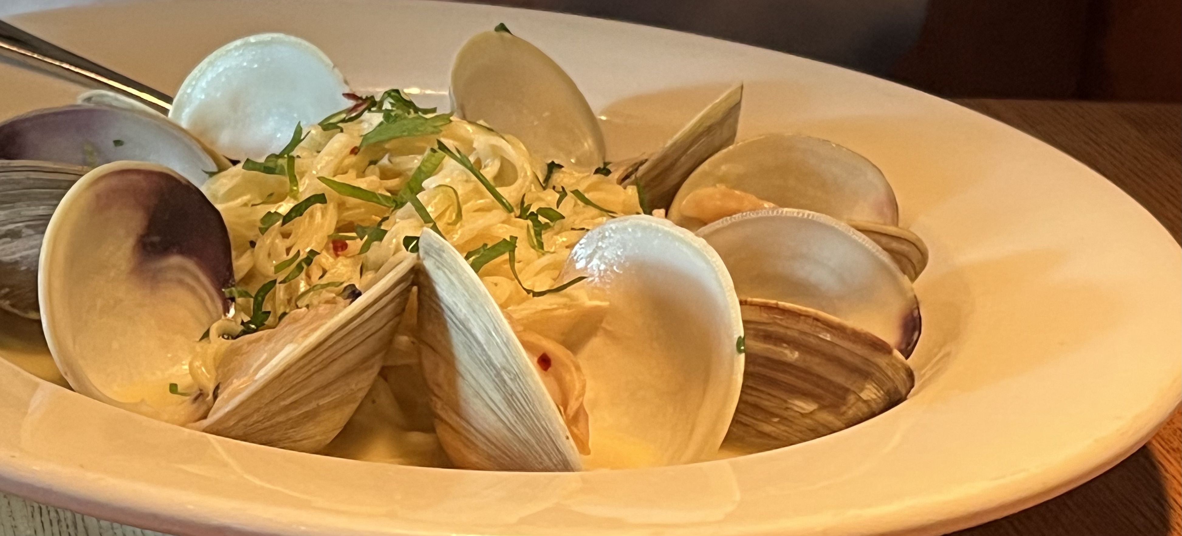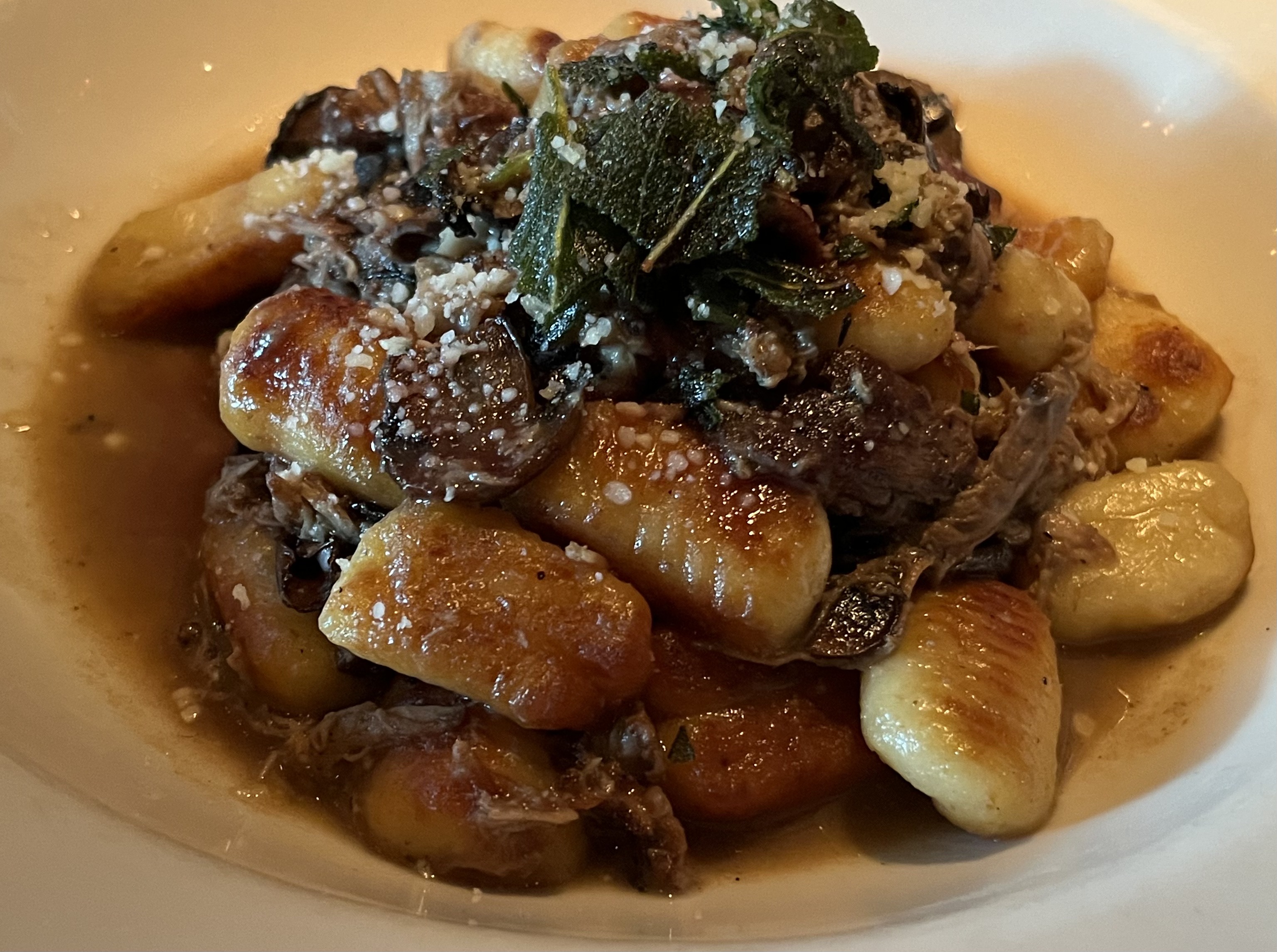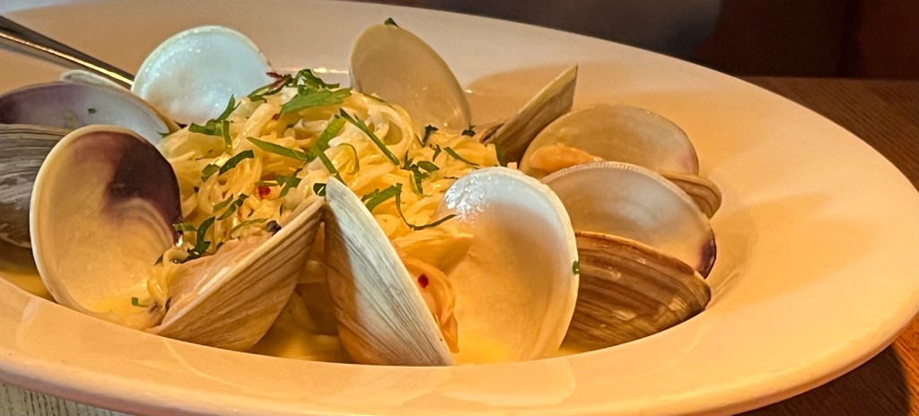 Clearly we had to go there last night. Neither of us was particularly hungry, but fhat’s why the Flying Spaghetti Monster invented take-out containers. Barbara had linguini with clams, in a sauce of white wine, butter, parsley, and chili flakes — with peas on the side. I had the aforementioned duck, which came in the form of pulled duck braised with gnocchi, fried sage, mushrooms, and parmesan, in a pomegranate glaze. And I helped Barbara cope with her healthy side of peas. All-around yum, yum, yum — and more than enough, so we put those take-out containers to good use. Service from Brandon was excellent as always.