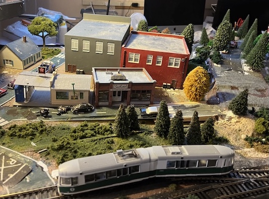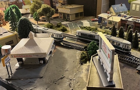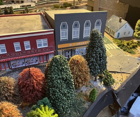 This month’s exploration of my model railroad layout is our third look at an individual neighborhood of Rose City. Back in the 1940s some developers noticed that there was a lot of still undeveloped property just north of PowerTown. Clearly it was a good spot for a soon-to-be-growing suburb or two. People started buying up property and forming Home Owners Associations — not that there were any homes yet to own, but investors are always optimists. Now in 1969 you can see some buildings from the ’40s and ’50s, as well as plenty of newer ones that had been built in the ’60s. The latter group are all to the east and north of the photos here, so you can’t see them in this post. But you see some of the early development — familiar names like Texaco, KFC (with its original unabbreviated name), W.T. Grant, and Woolworth — and a suburban home or two to suggest the rest.