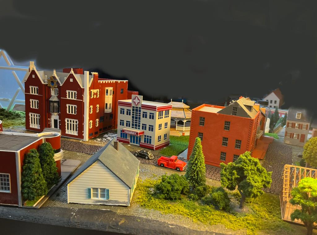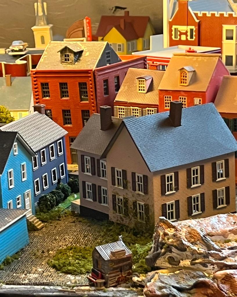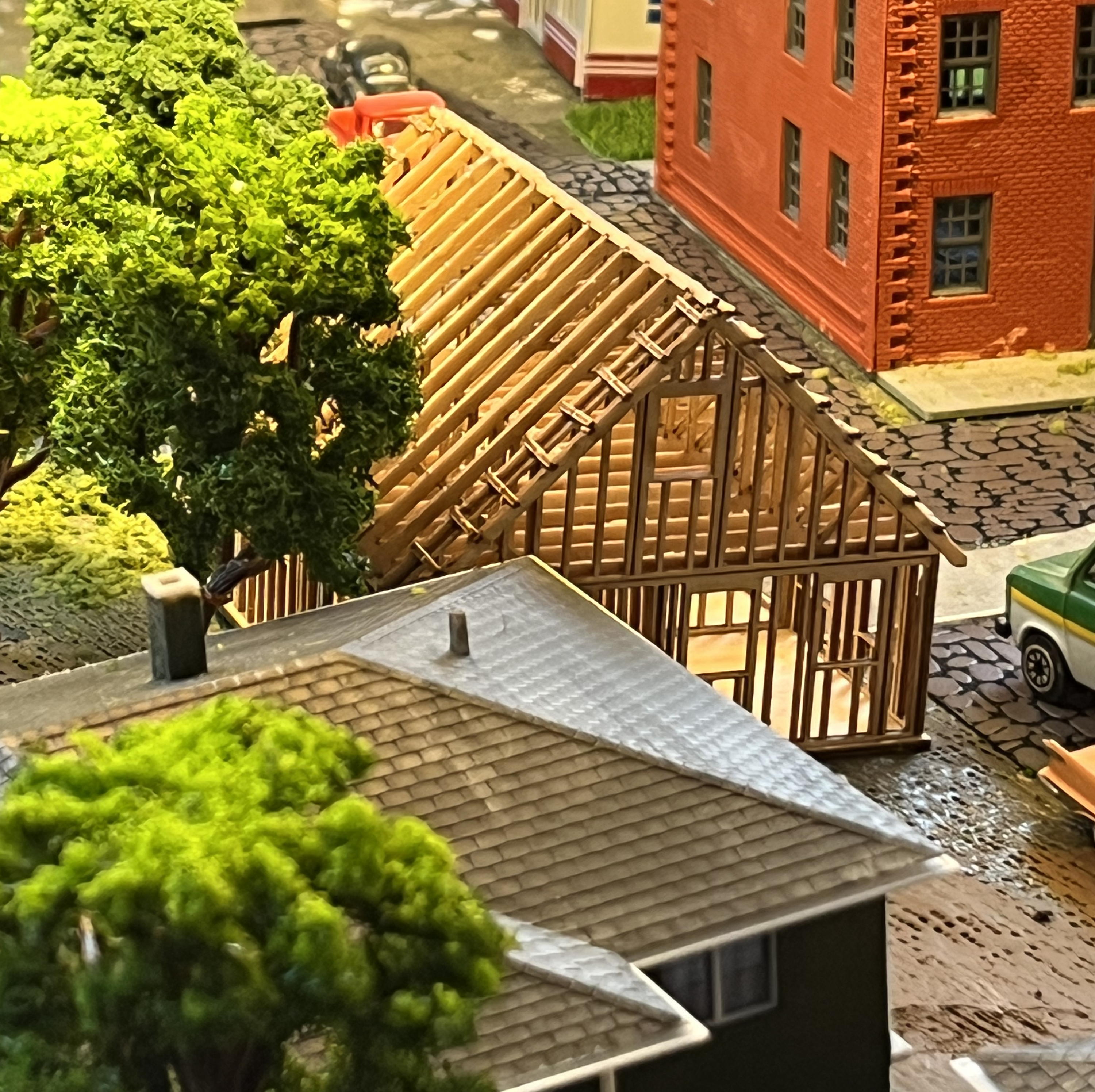 You may be wondering about the tiny house at the bottom. Even at HO scale it looks too small. But that’s because it’s the kids’ play house for the family in the light blue house to the left.
