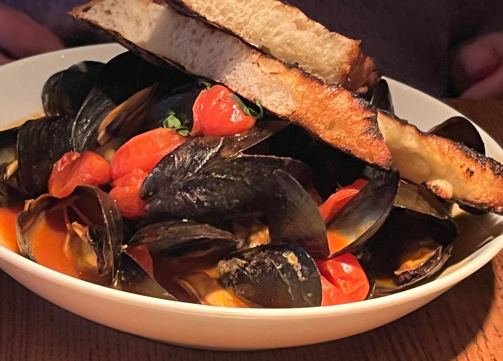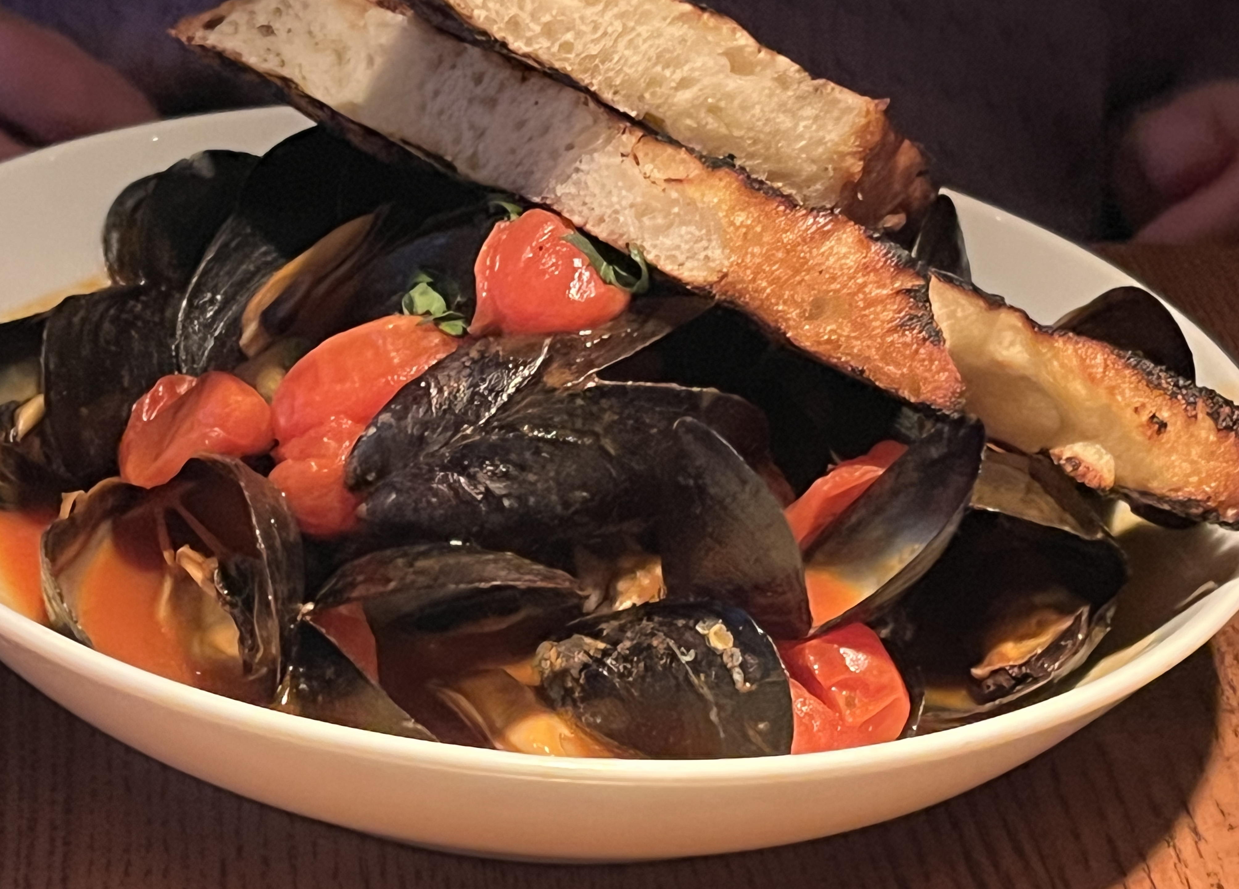 Barbara started with the steamed mussels, which came with fennel, garlic, tomatoes, and grilled bread. As she requested, they omitted the promised Pernod. It was excellent, as well as being a work of art: