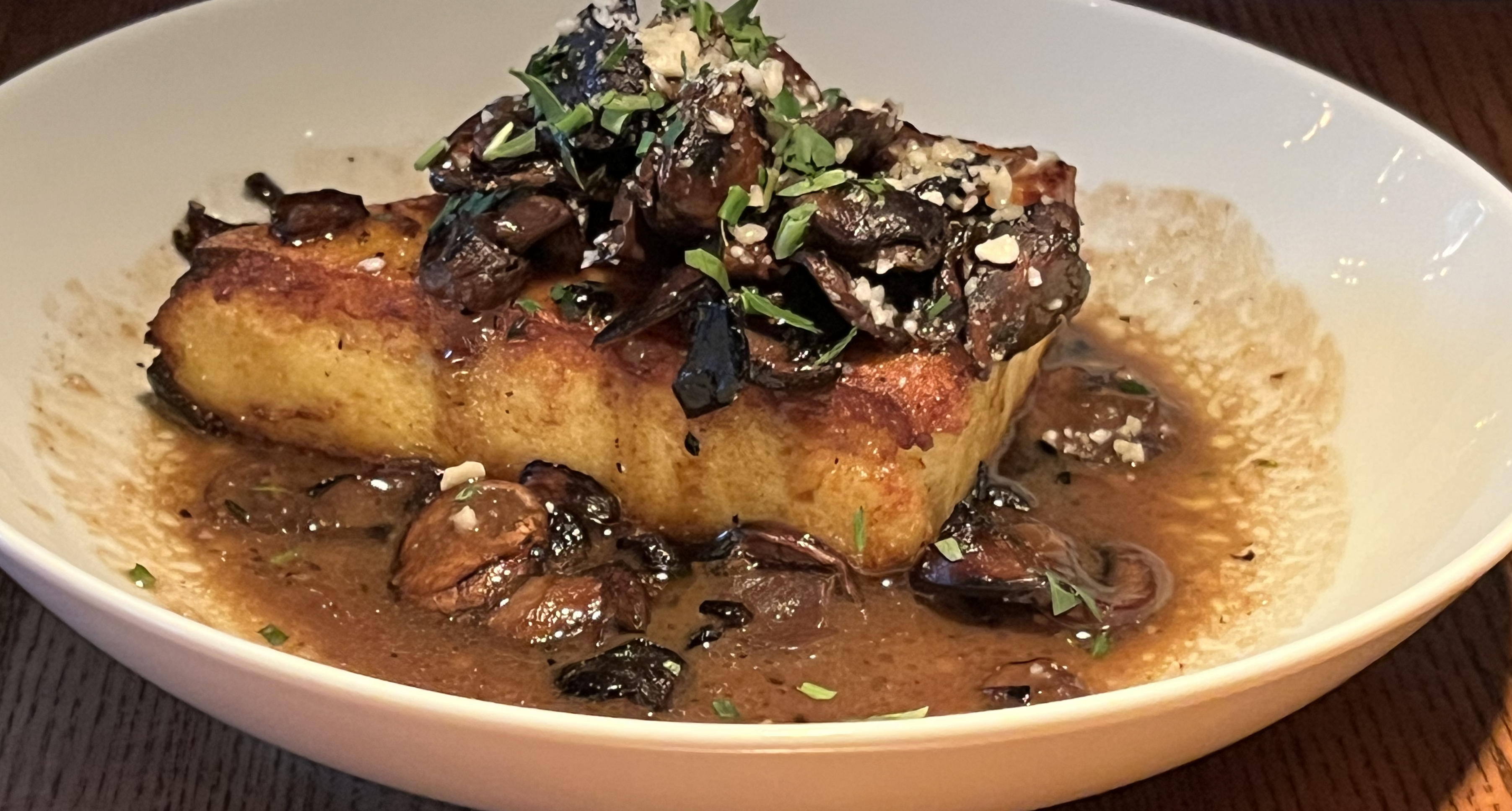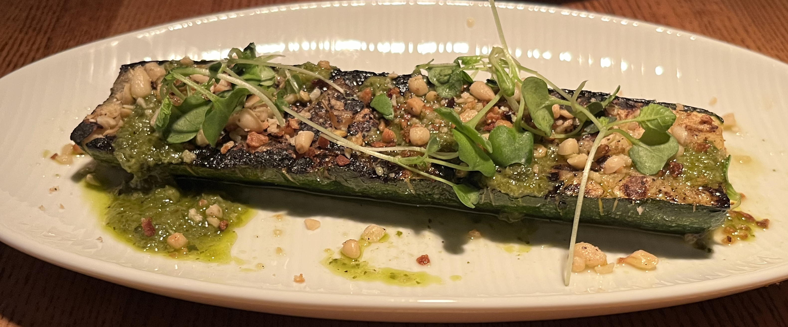 Instead of a main dish, Barbara ordered a combination of polenta à la Icarus (polenta with Madeira-braised mushrooms and parmesan cheese) and zucchini with pine nuts: