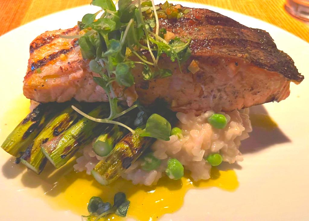 Finally, I had grilled salmon over pea risotto, grilled asparagus, and Calabrian chili oil: