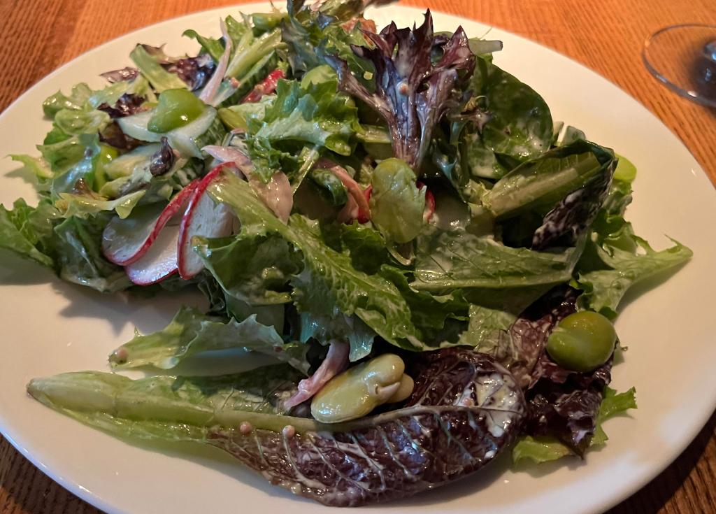 I started with a wonderful “spring salad,” consisting of fava beans, radish, mixed greens, cucumber, pickled red onion, croutons, and green goddess dressing. Yummy!