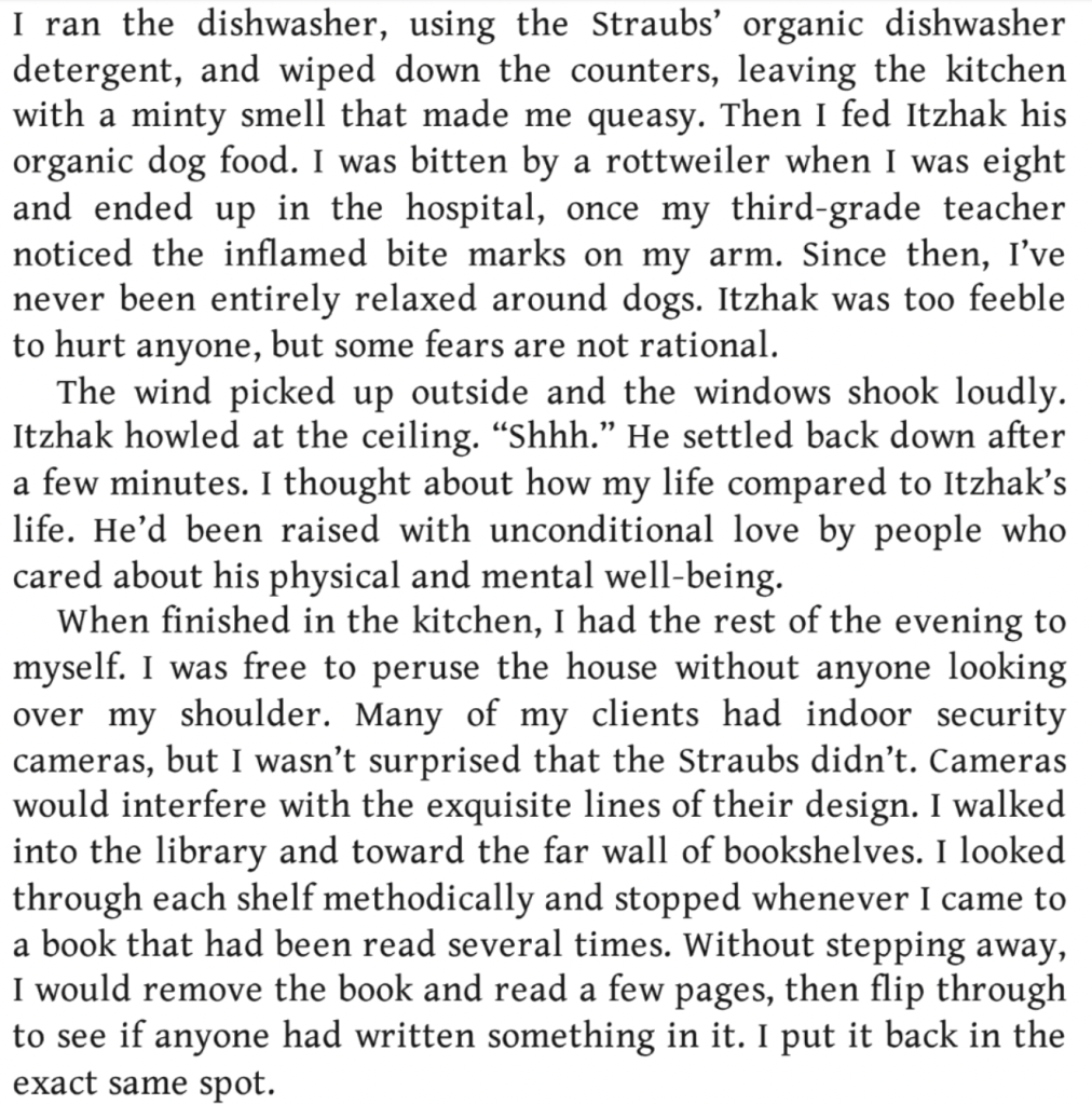 This puzzle didn’t bother me too much, since I found the rest of the story so interesting that I just kept reading. Ultimately — and this is not a spoiler — we’re getting a glimpse into a world of well-to-do Jewish New Yorkers and a different world of a young woman who uses photography to get into it. I can’t really tell you more or I would be committing spoilers, so let me just reiterate that I couldn’t put it down. YMMV, of course. I will close by quoting a page in the second chapter: