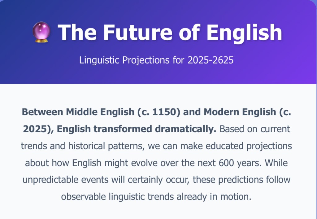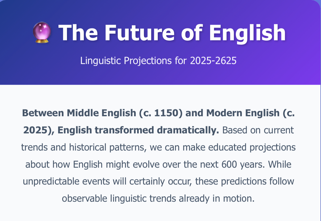 Recently I’ve been playing with Claude AI, so I asked it (him? are we personifying AI’s these days?) to predict how English will change over the next 600 years. (Why 600? Because Middle English was spoken about 600 years ago, and I want Claude to predict a similar interval into the future.)