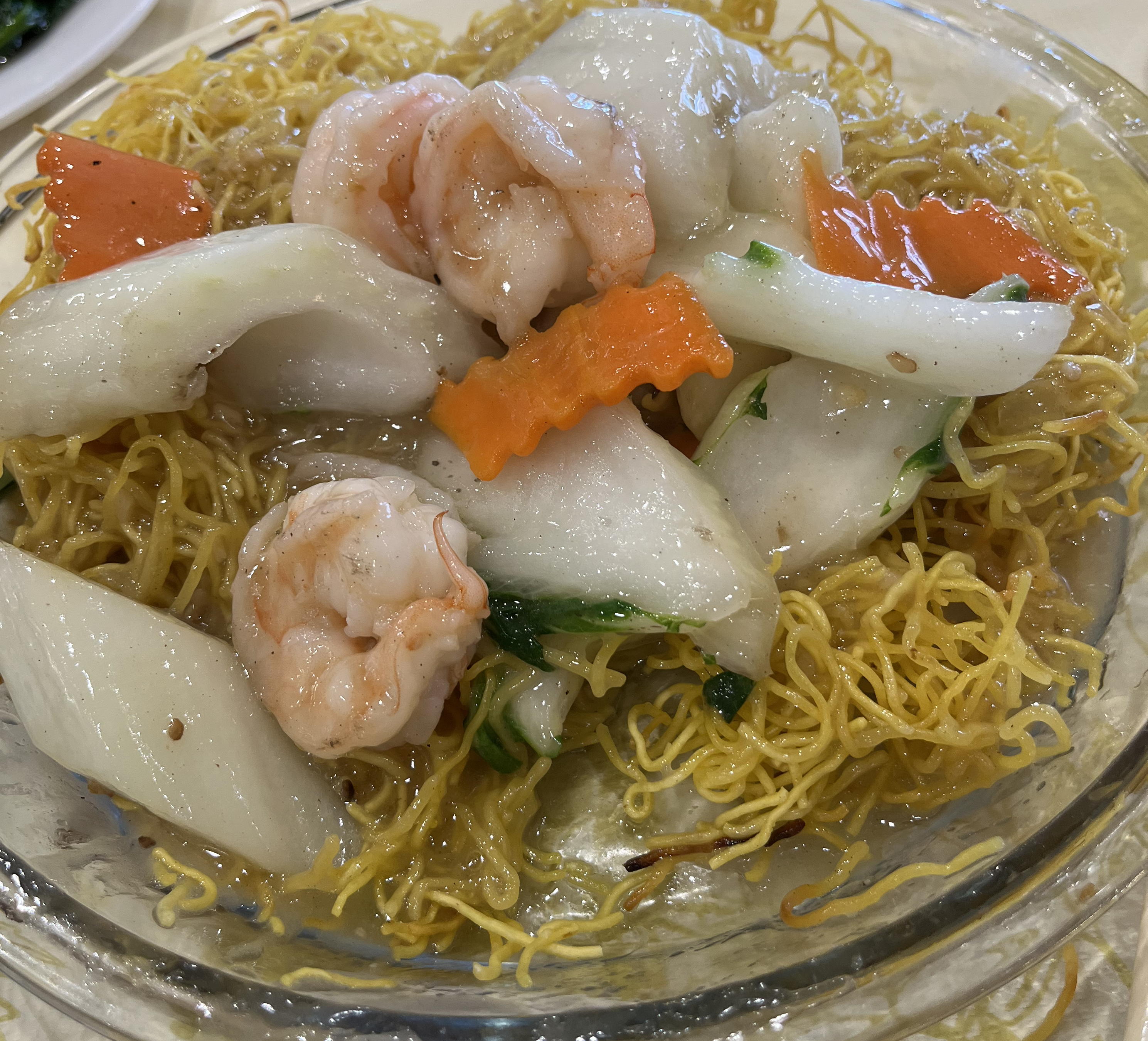 In accordance with long-established tradition, Barbara and I went to Chau Chow yesterday for a delicious Christmas feast: beef noodle, Chinese broccoli, har gao, shumai, xiao long bao, shrimp paste in tofu skin, stuffed taro, and pan-fried noodles with jumbo shrimp. Needless to say, there were plenty of leftovers — so we also ordered moo shu pork and clams in black bean sauce to go. We’ll be hungry again in a week.