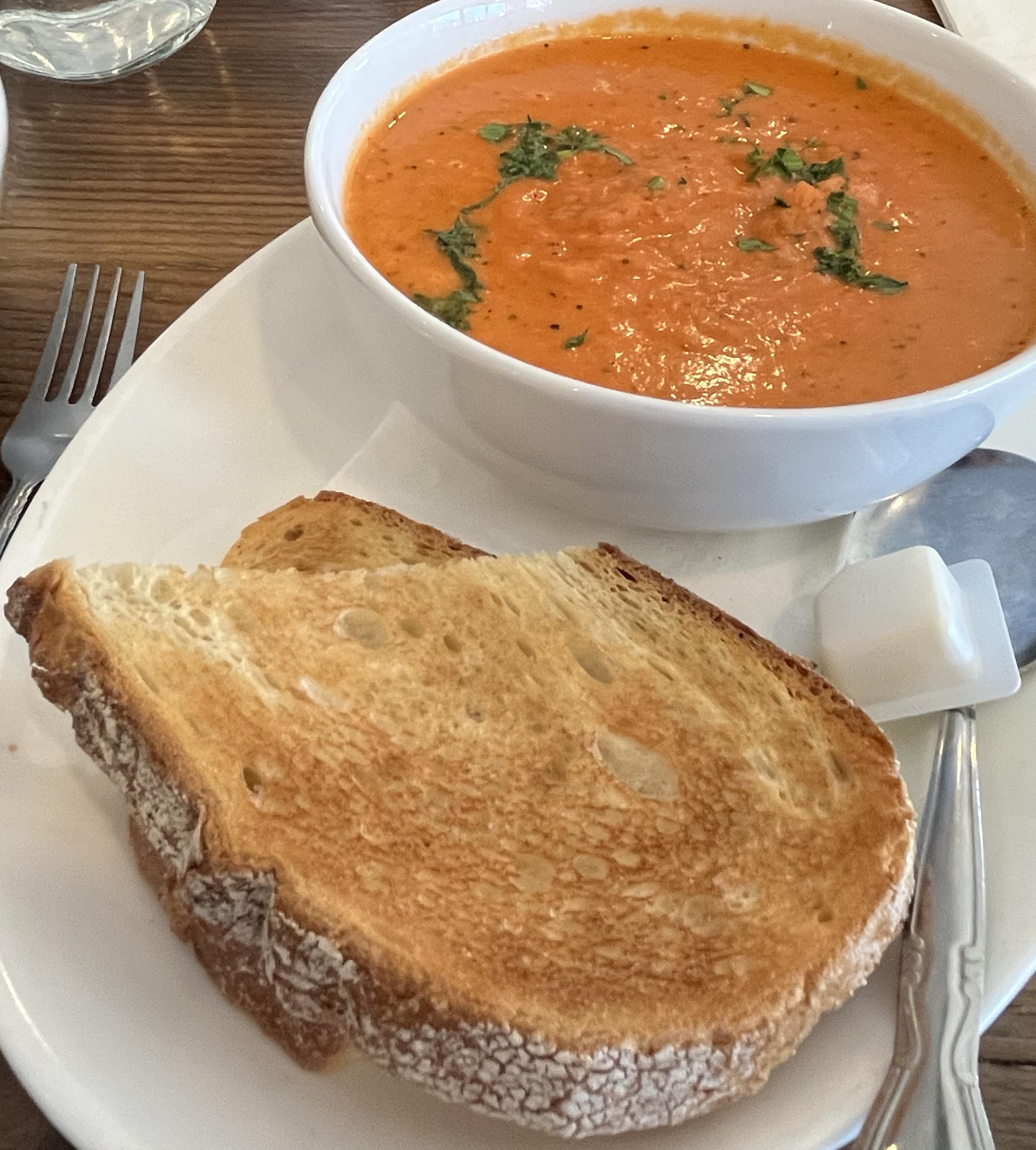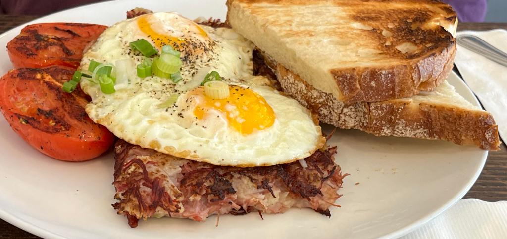 Barbara had the traditional homemade house-made corned beef hash, which came accompanied by grilled Roma tomatoes, two sunny eggs, and sourdough toast. I had a large bowl of creamy tomato soup with fresh basil and grilled sourdough, accompanied by a huge Caesar salad. The soup was clearly the star of the show today!
