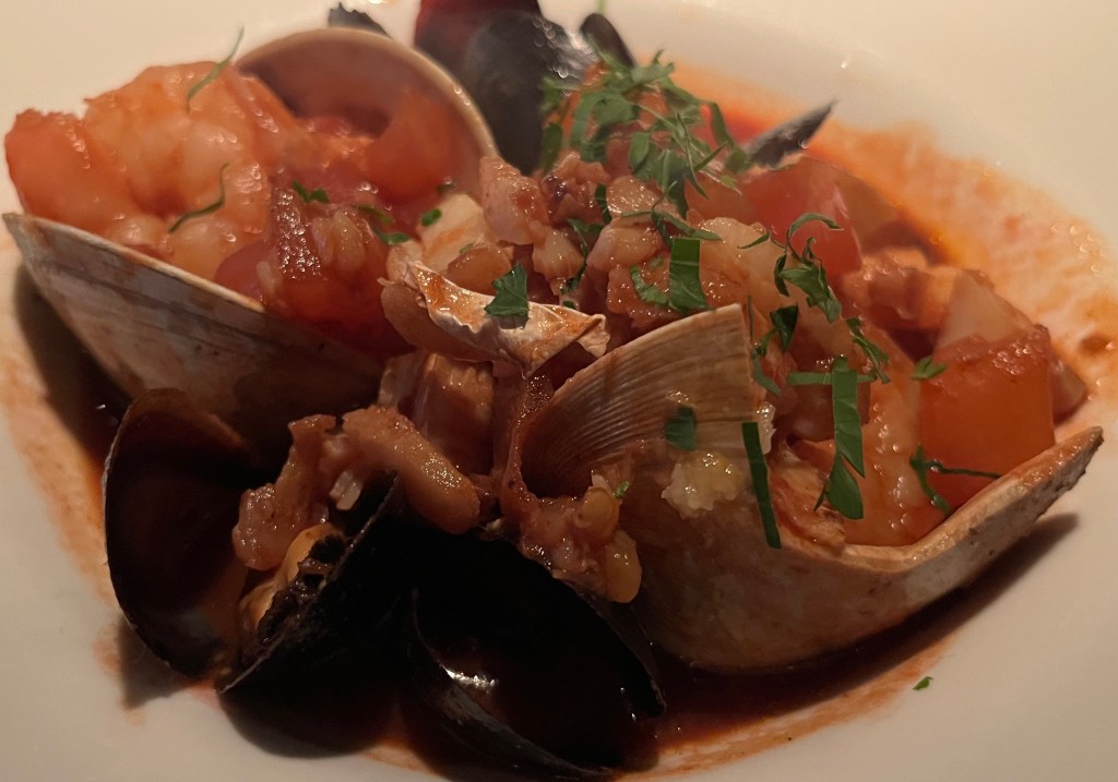 According to Google AI, cioppino is “a hearty Italian-American seafood stew from San Francisco, made with a tomato and wine broth filled with a variety of fresh fish and shellfish like clams, mussels, shrimp, and crab, using whatever the “catch of the day” was. It originated with Italian immigrant fishermen in the late 1800s and is traditionally served with crusty sourdough bread for dipping.” And that‘s exactly what I had at Tavolo last night.
