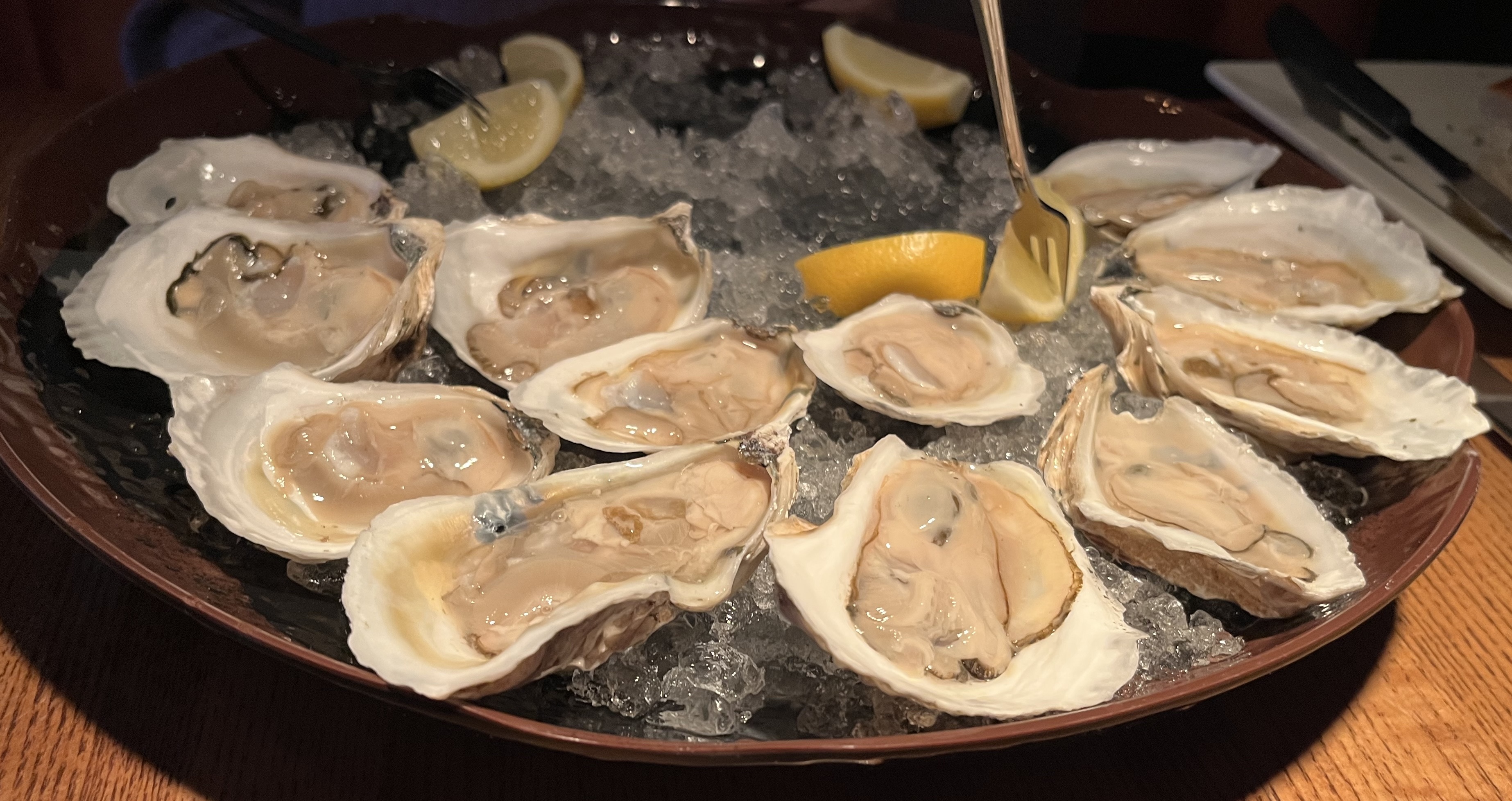 Also according to Google AI, buck-a-shuck “offers $1 oysters, a popular happy hour deal in Boston and Southeastern Massachusetts.” No Italian immigrant fishermen this time, but somebody had to bring in all those oysters. Barbara had 18 of them. That’s 18 too many from my POV 🙁. Barbara disagrees.