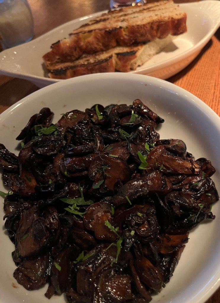 My cioppino was accompanied by the aforementioned crusty sourdough bread for dipping (two large grilled slices), and I also ordered one serving (just one, which still turned out to be far too much) of grilled mushrooms. Everything was delicious.
