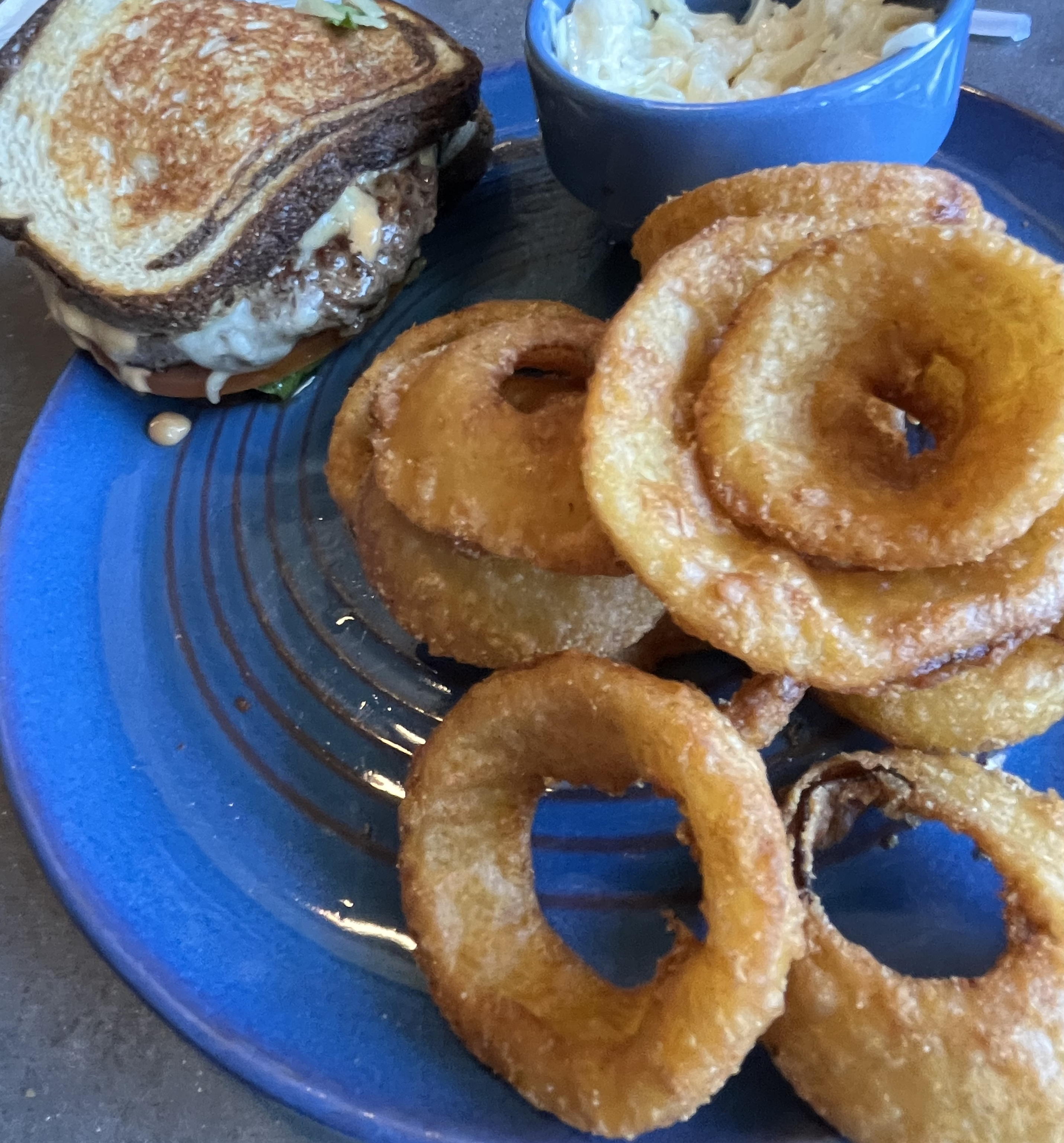I had a patty melt, which came on rye toast, as one might expect, with swiss cheese, lettuce, and tomato, and with cole slaw and real onion rings — as opposed to the fake rings that some places construct out of chopped-up onion pieces. (It was lunch time for me.)